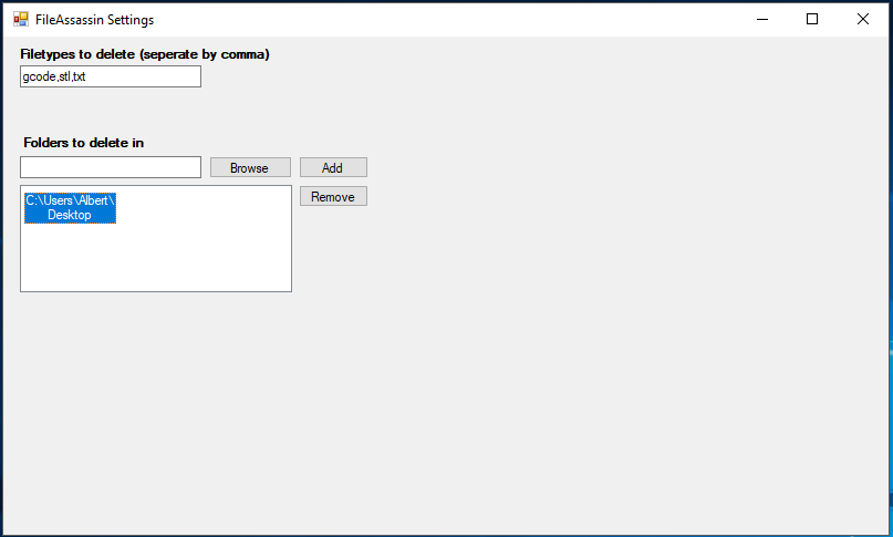 The project consists of two .exe files. One "Settings" executable where you specify which folders the FileAssassin executable should look in, and which file extensions to look for.