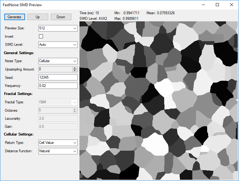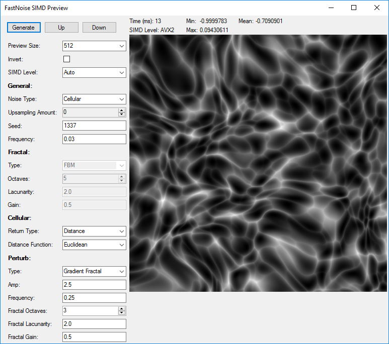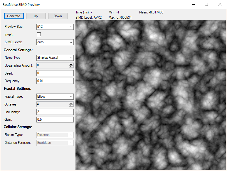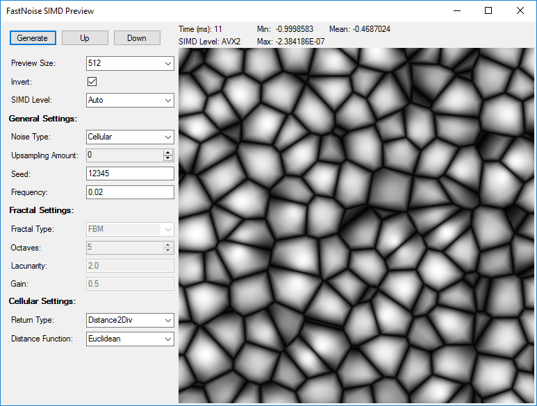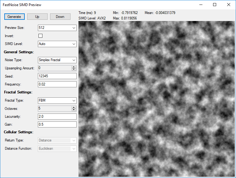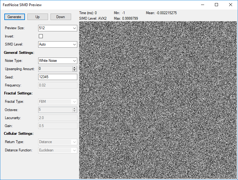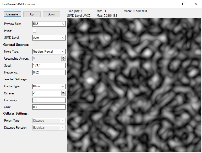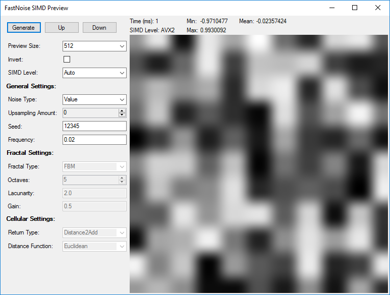 I have written a compact testing application for all the features included in FastNoiseSIMD with a visual representation. I use this for development purposes and testing noise settings used in terrain generation. The fastest supported instruction set is also reported.