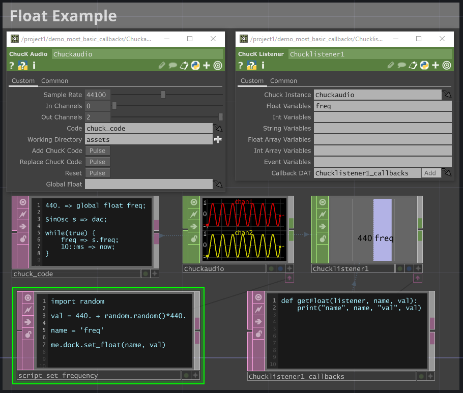 In the example above, we used a global float freq and a global int randInt. Find the Float Variables and Int Variables custom parameters on the ChucK Listener CHOP and set them to freq and randInt respectively. Now freq will appear in the getFloat callback, and randInt will appear in the getInt callback.