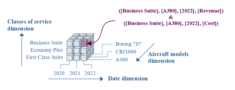 EuclidOLAP also extends the multidimensional data model, for example, adding the concept of dimensional role, which means that a cube can be associated with the same dimension multiple times, and each association indicates that this dimension represents a different role, which can better support certain data analysis scenarios, for example, statistical analysis of international trade ocean transport ship logistics data, which contains the ship's departure date and port call date.