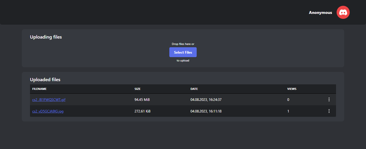 Simple front end app that supports file drag & drop and manual file selection, it doesn't require any authorization to upload or download files, but you could sign in via Discord oauth to preserve the info about uploaded files, otherwise they would be preserved as long as the session lives (which is configurable).