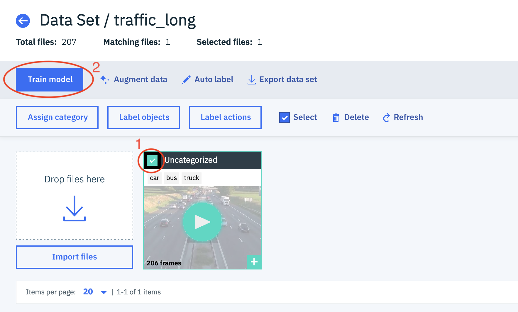 In this example, we'll build an object recognition model to identify specific objects in each frame of a video. After the images have completed uploading to the dataset, select one or more images in the dataset, and then select "Label Objects".