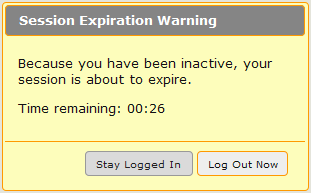 idleTimeLimitamount of user inactivity, the warning dialog box with 2 buttons appear. Default button may be activated with mouse click or press of Enter key. - Warning dialog includes countdown 'Time remaining' display.