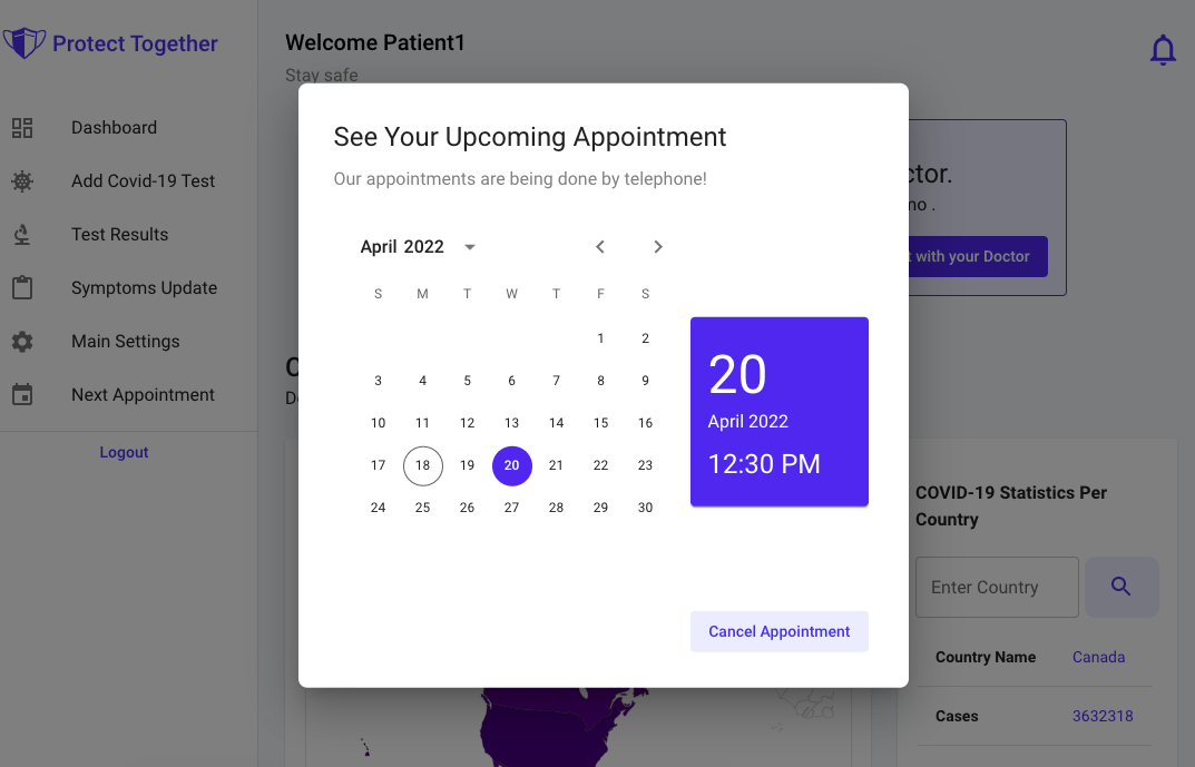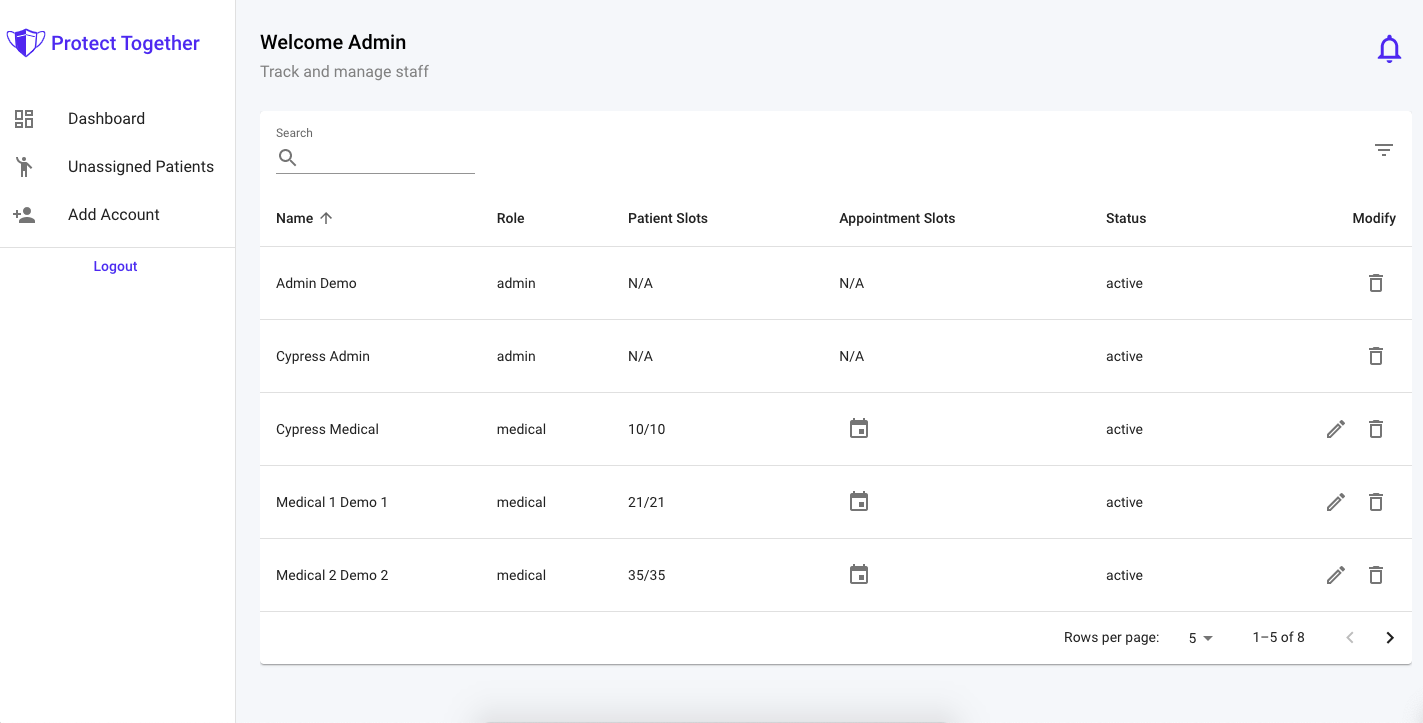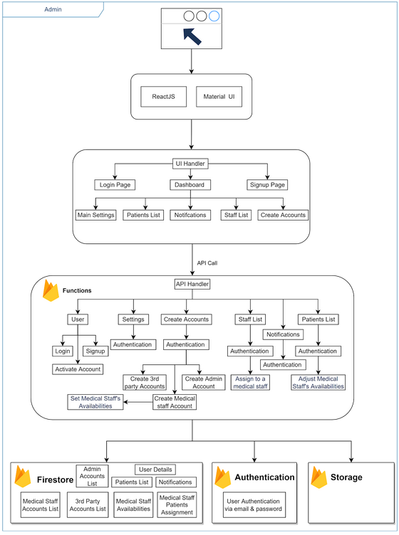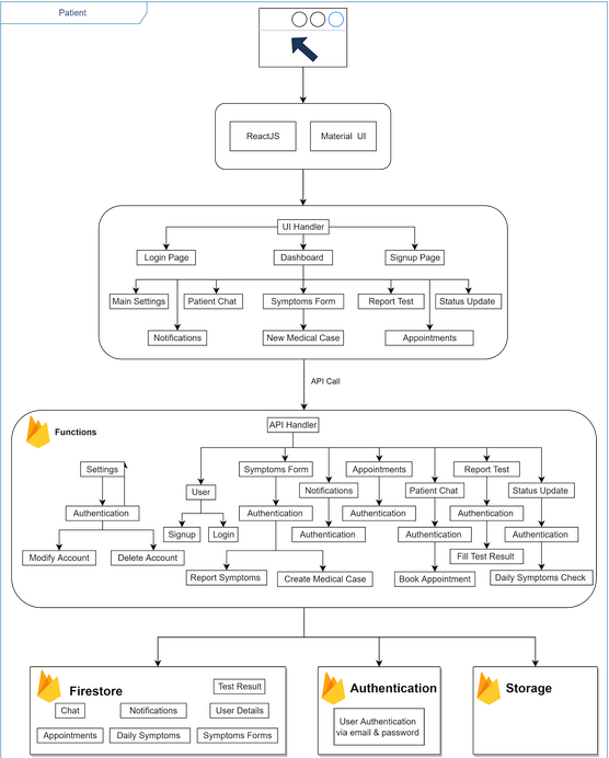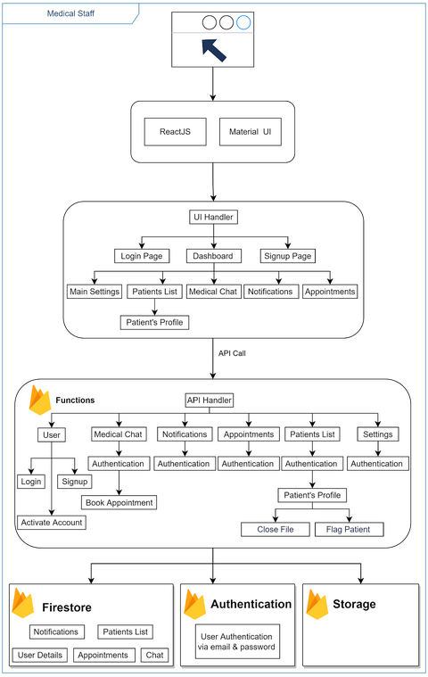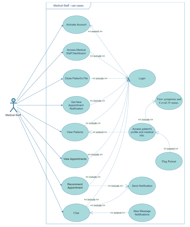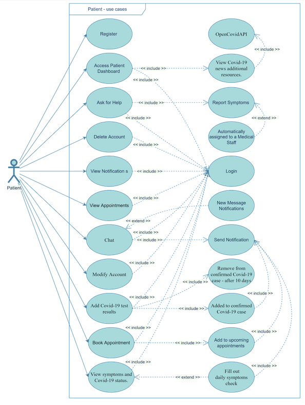 Four various users can benefit from this app, first group being the general public as they register to the website they will be asked to fill in a symptoms form that would indicate if they are infected or not if they are they would be assigned to a medical staff. These patients will be obligated to fill in a daily symptoms list and follow the instructions of their doctor to track the progress of the virus. Additionally they can initiate messages with their allocated doctor and be notified when they receive a new update. Second and third group of users would be the medical staff and admins. Admins will assign patients to each doctor and will be able to manage their schedules and patient list. Consequently doctors will be able to view a list of their patients and medical information along with initiating or responding to messages. If required a doctor can suggest a patient to schedule an appointment with them. The final group of users are the third party users who will be able to view a patientβs metadata and their health status.