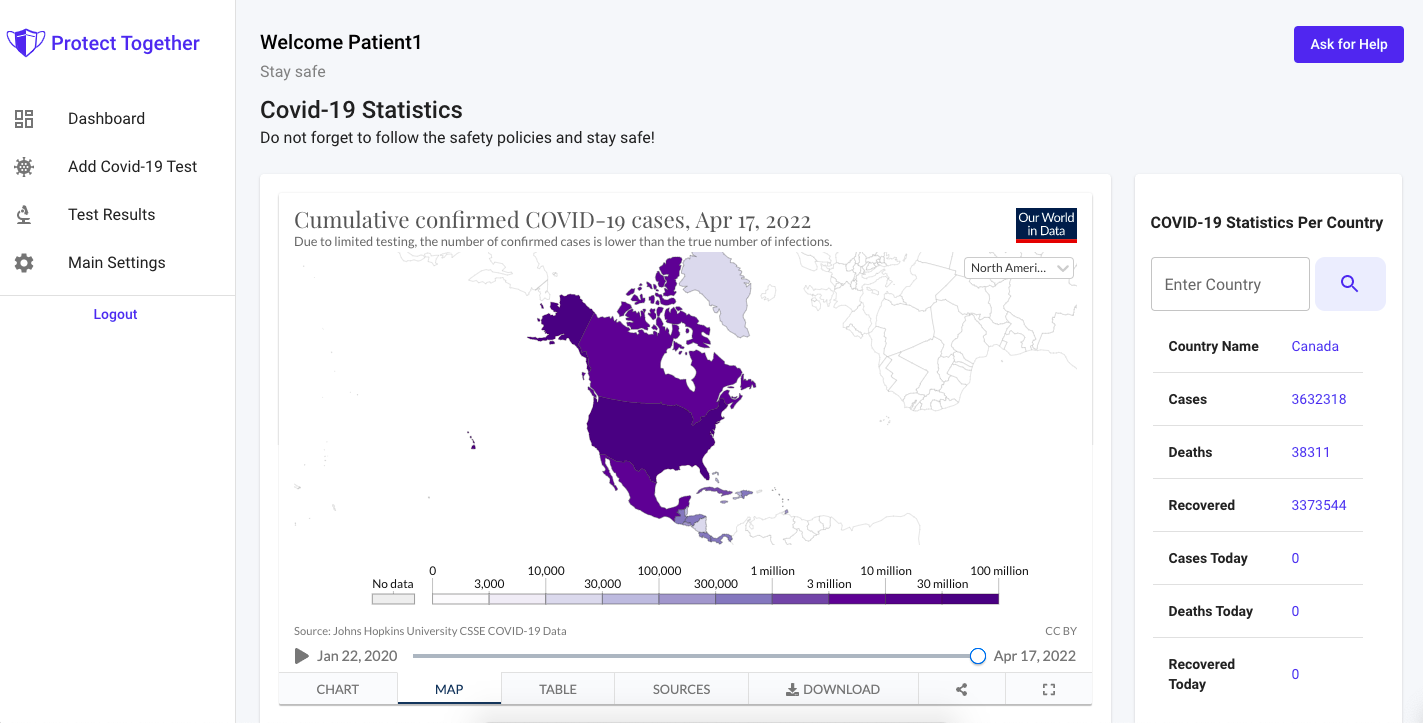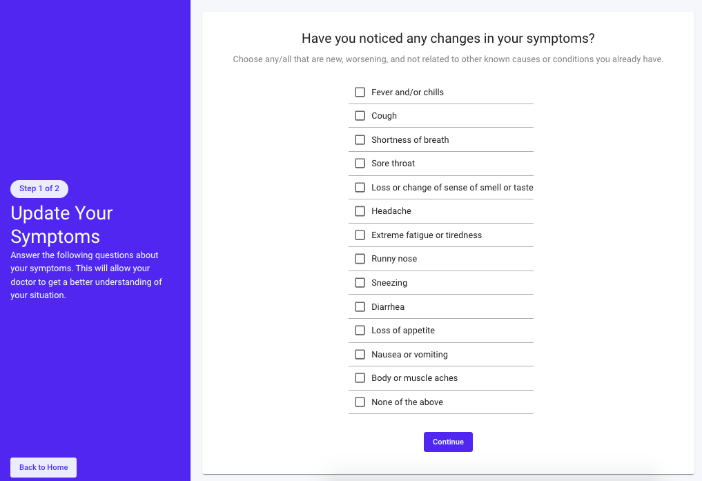 This web application facilitates tracking covid symptoms and helps various users to know if their symptoms are relevant to covid, easily put them in contact with medical personnel and doctors and allow them to access various functionalities through the different user dashboards available. Consequently doctors, admins and third party users have their own special dashboards that are made up of various features and functionality depending on what they need access to. In order to follow scrum and manage the system development process our team was separated into 5 groups with their own specializations and a scrum master that would make sure the project is on track and can meet the deadlines following scrum rules. Each team was allocated to work on one or more of the following: documentation, frontend and user interface, backend and system architecture, testing and QA. Some members participate in more than one group, and everyone participates in weekly stand ups and reports on what they have completed, what they are working on now, and what they will be working on in the upcoming week. Additionally if anyone has encountered a project block the team would suggest various solutions that would help them to resolve the block and progress in what they were working on.