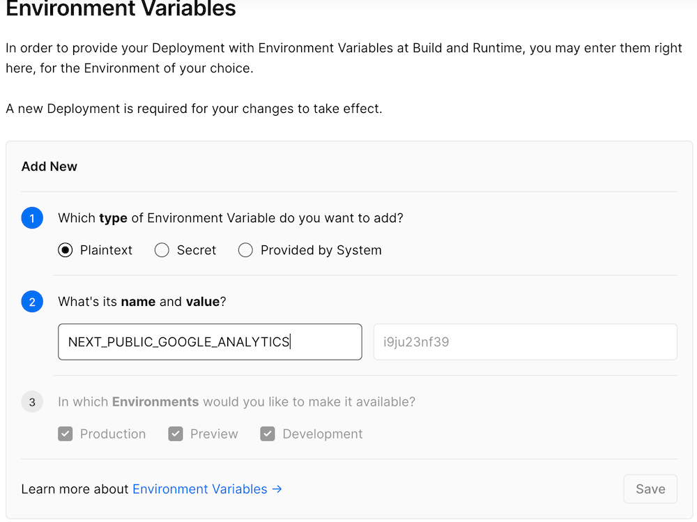 In Vercel, you can set this by going to your project, then Settings and finally Environments Variables. To get GA 4 code G-ZXX0000XXX follow these steps
