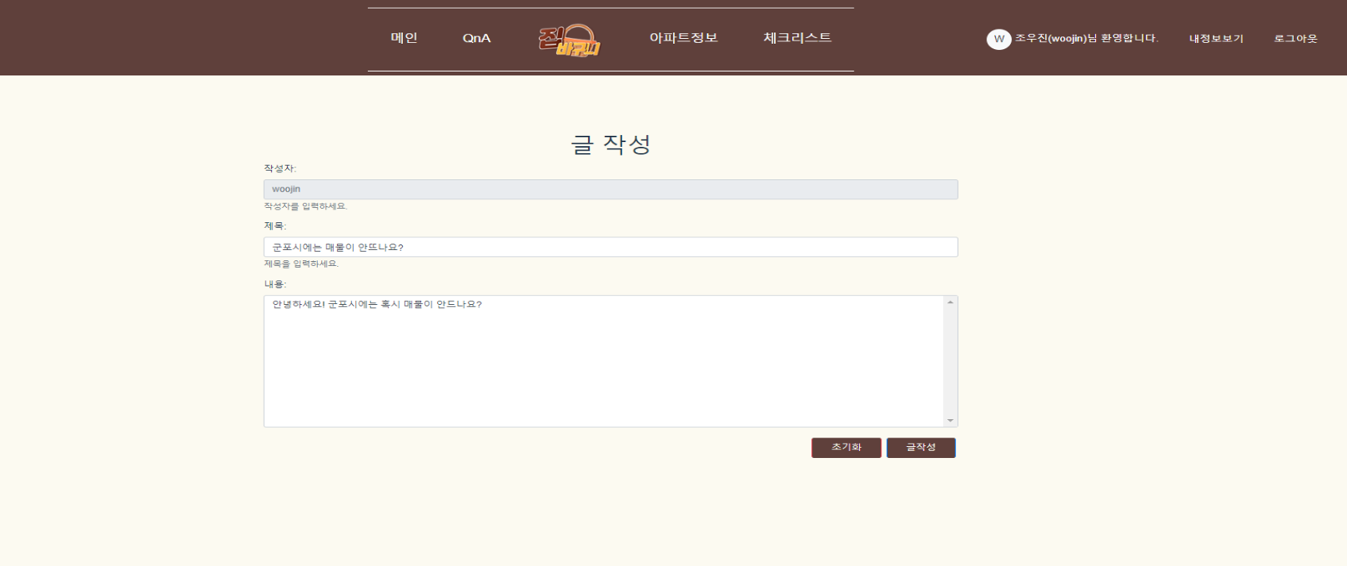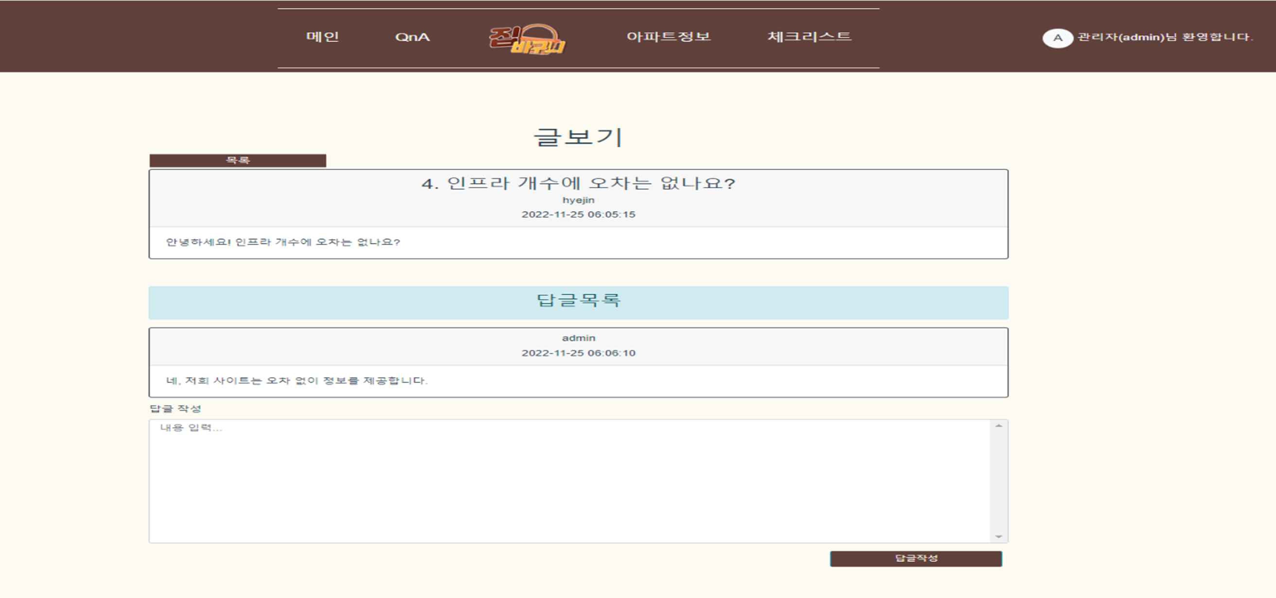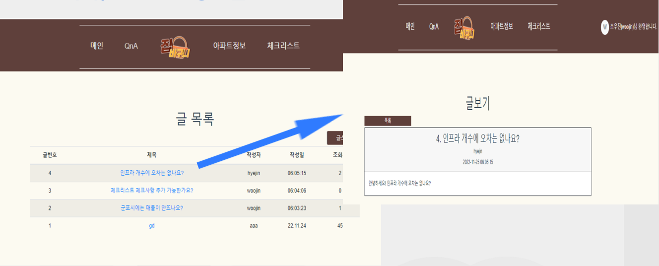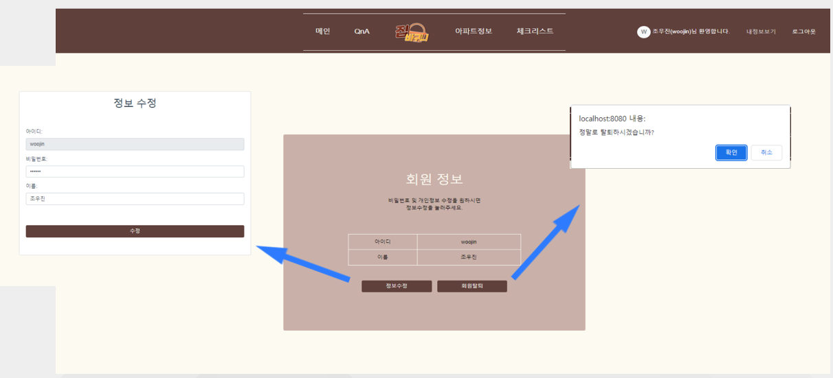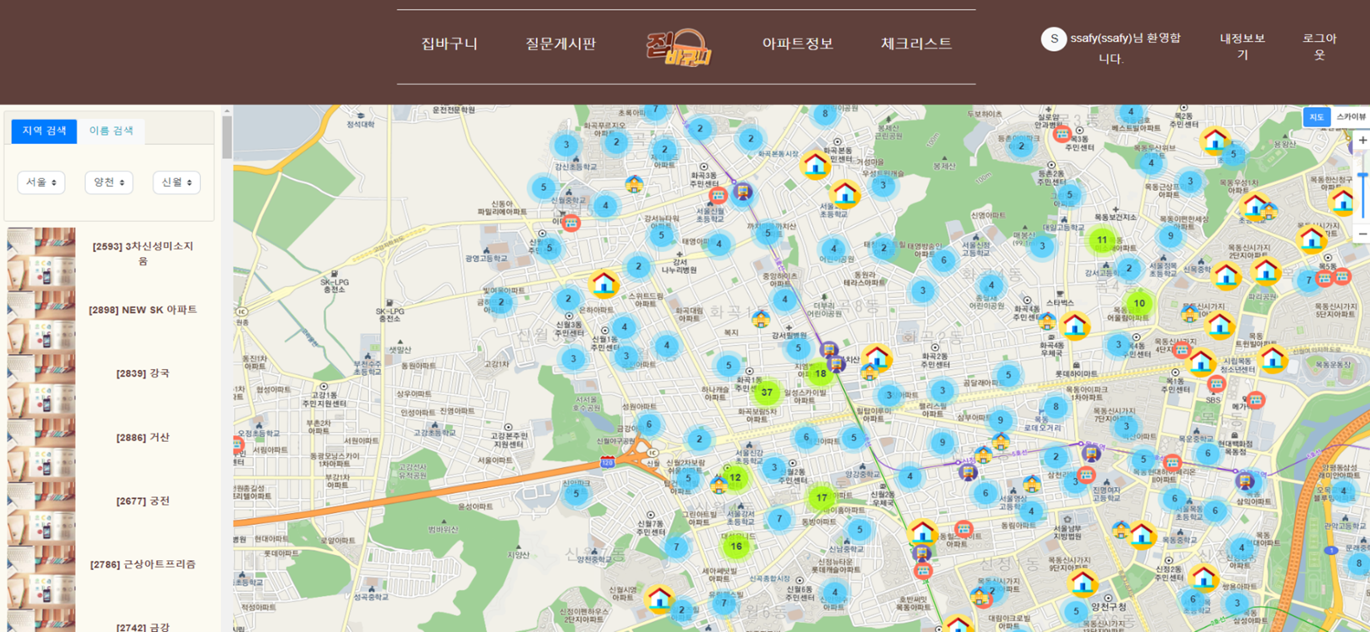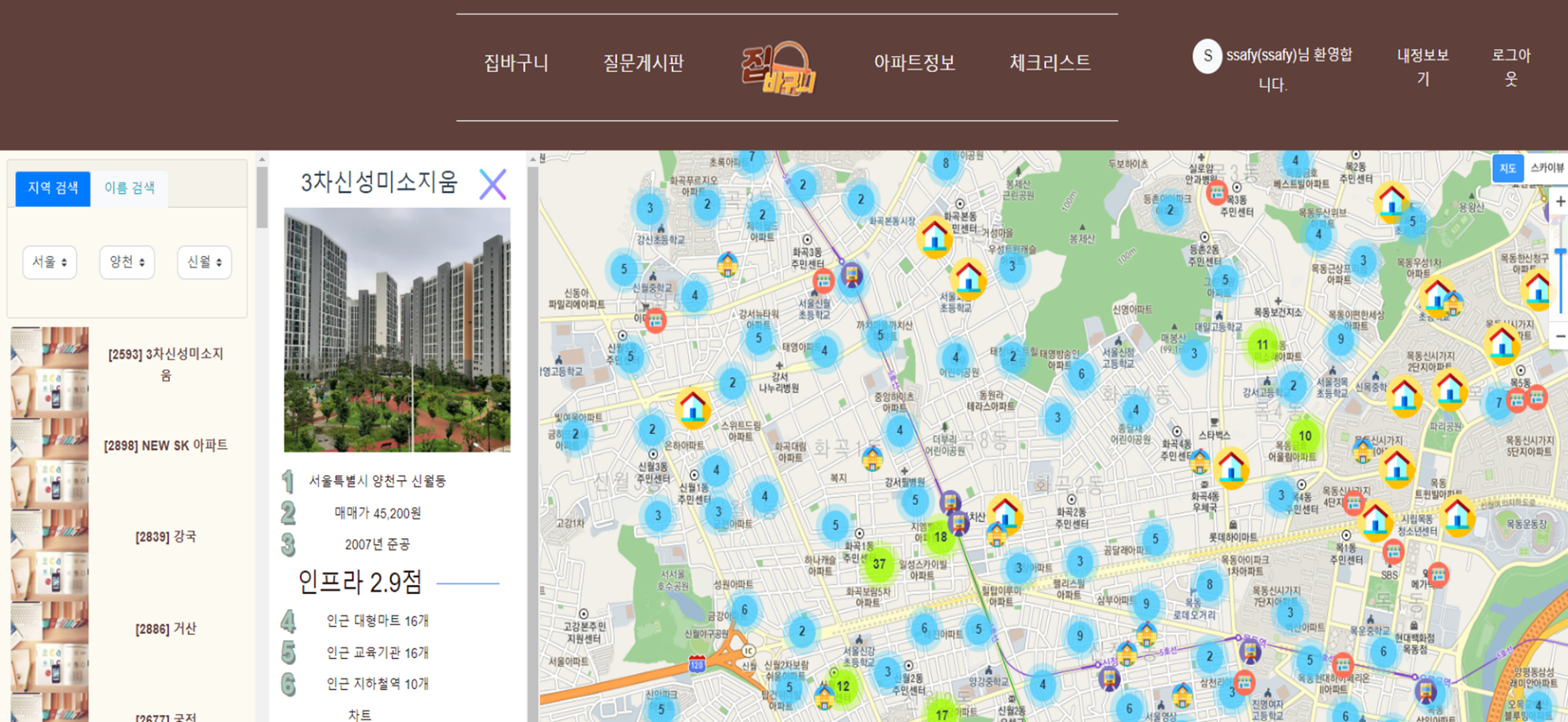 집바구니 (happyhouse) 목차 프로젝트 소개 주요 기능 개발 환경 🏠 프로젝트 소개 팀원 (2명) 조우진(팀장), 윤혜진 진행 기간 2022.11.18~2022.11.25 프로젝트 개요 서비스명: 집바구니 (아파트 실거래가 조회 서비스) 소개: 공공데이터를 활용하여 아파트 실거래가를 조회하고, 찾고 있는 아파트의 주변 인프라 정보 확인과 수치화된 인프라 점수를 통해 아파트 거래에 도움을 주는 서비스 🤗 주요 기능 회원 로그인, 회원가입 회원정보 조회, 수정, 탈퇴 QnA QnA 작성, 수정 QnA 목록 QnA 답글 체크리스트 실거래가 조회 검색 결과, 클러스터링 매물 상세정보, 인프라 정보 제공 💻 개발 환경
