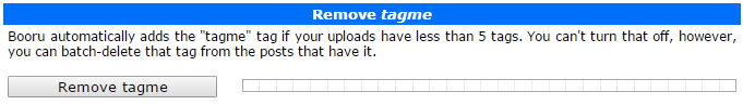 Made to overcome the needless "minimum of 5 tags" requirement that spams your uploads with the tagme tag, making it impossible to find posts that actually need to be tagged. Do note that this tool is only useful for admins, because it will attempt to edit any post it encounters and if you don't have right for it it'll fail and stop the progress. It is also advised to avoid editing other tags manually until the process finishes since booru limits the amount of consecutive edit queries and they're all used up by the script.