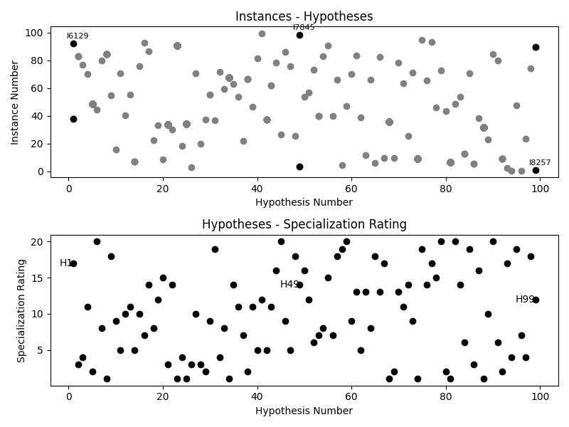 - 3 Example Hypotheses and 3 sample corresponding instances are printed and highlighted/plotted and labelled on the graph.
