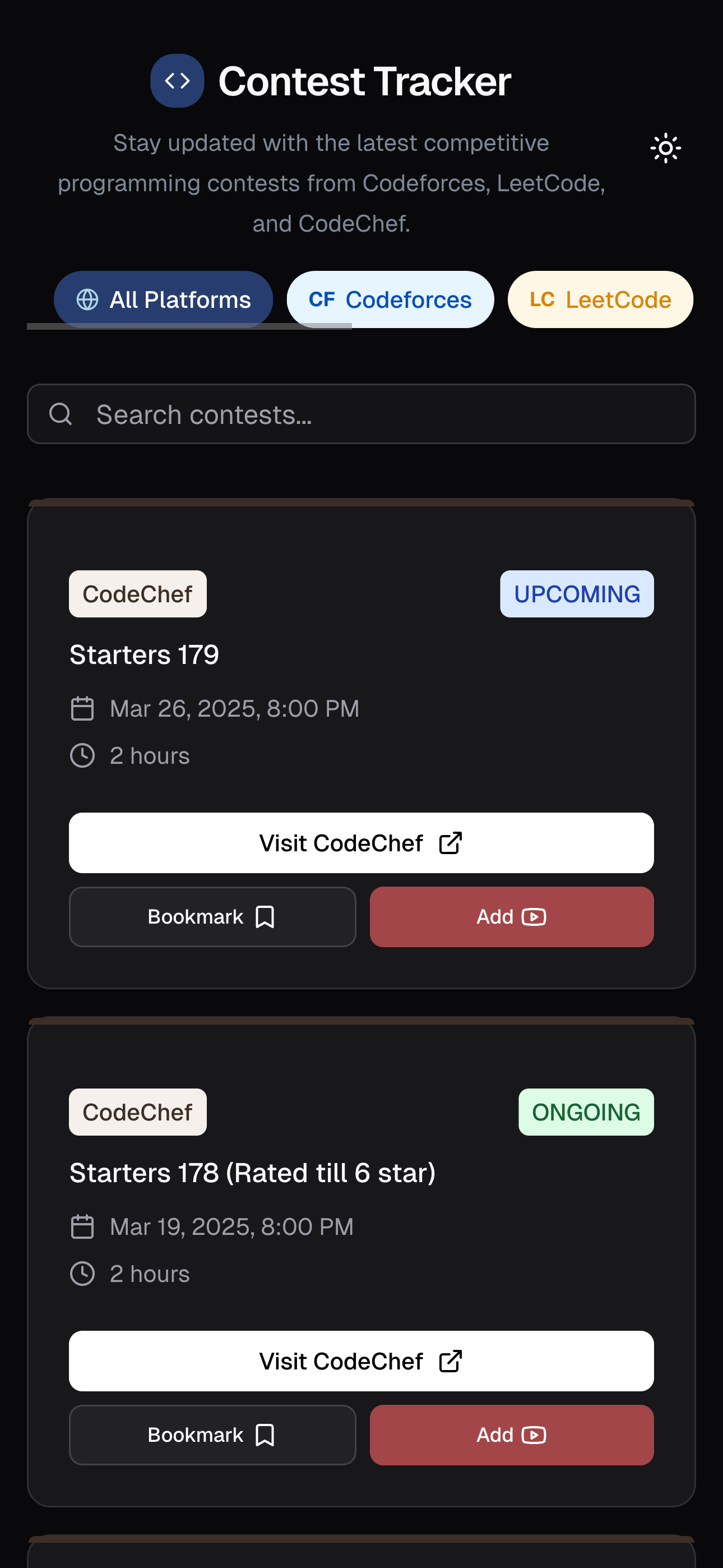 A web application that helps you stay updated with the latest competitive programming contests from multiple platforms including Codeforces, LeetCode, and CodeChef.