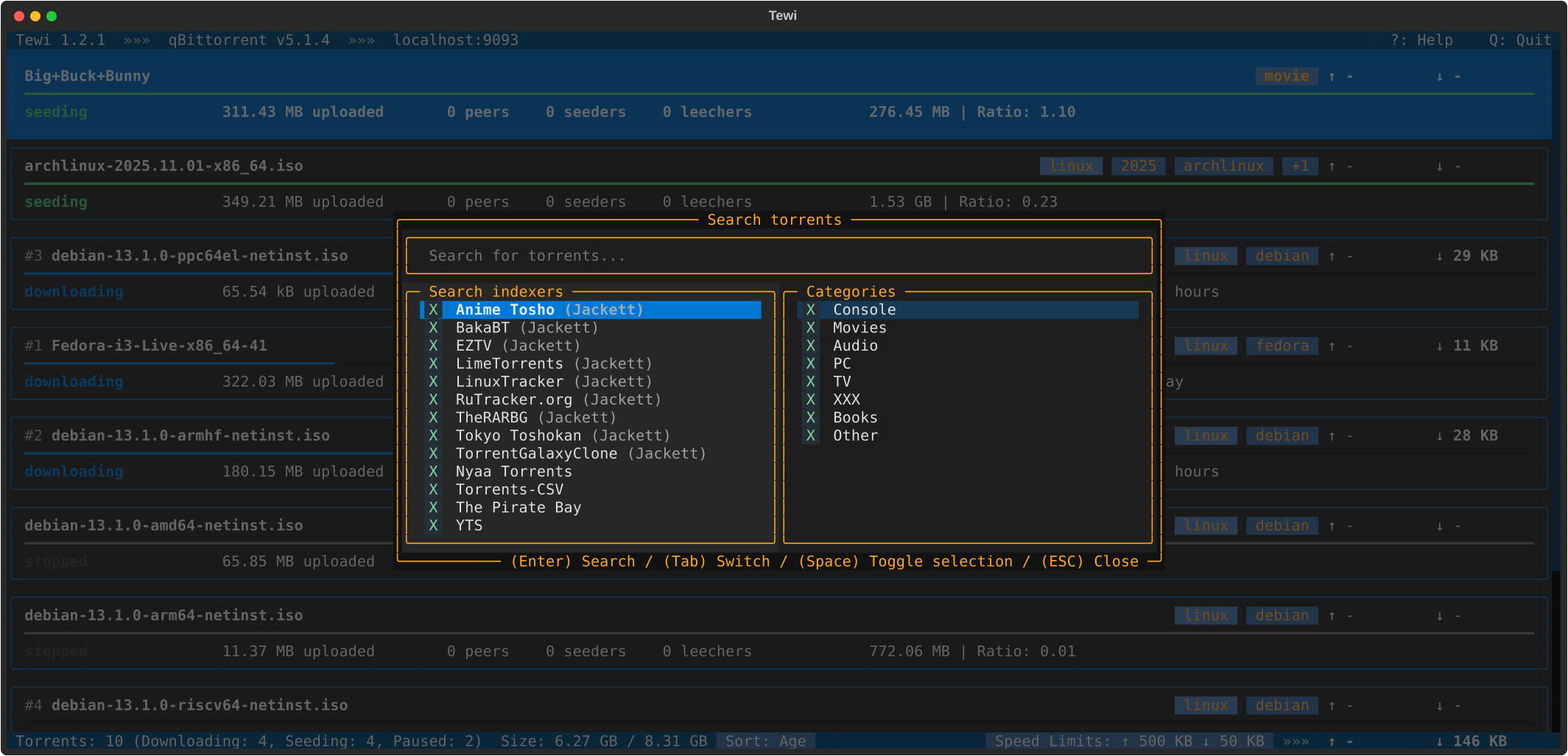 Tewi is a TUI (text user interface) for BitTorrent clients, supporting Transmission, qBittorrent and Deluge daemons.