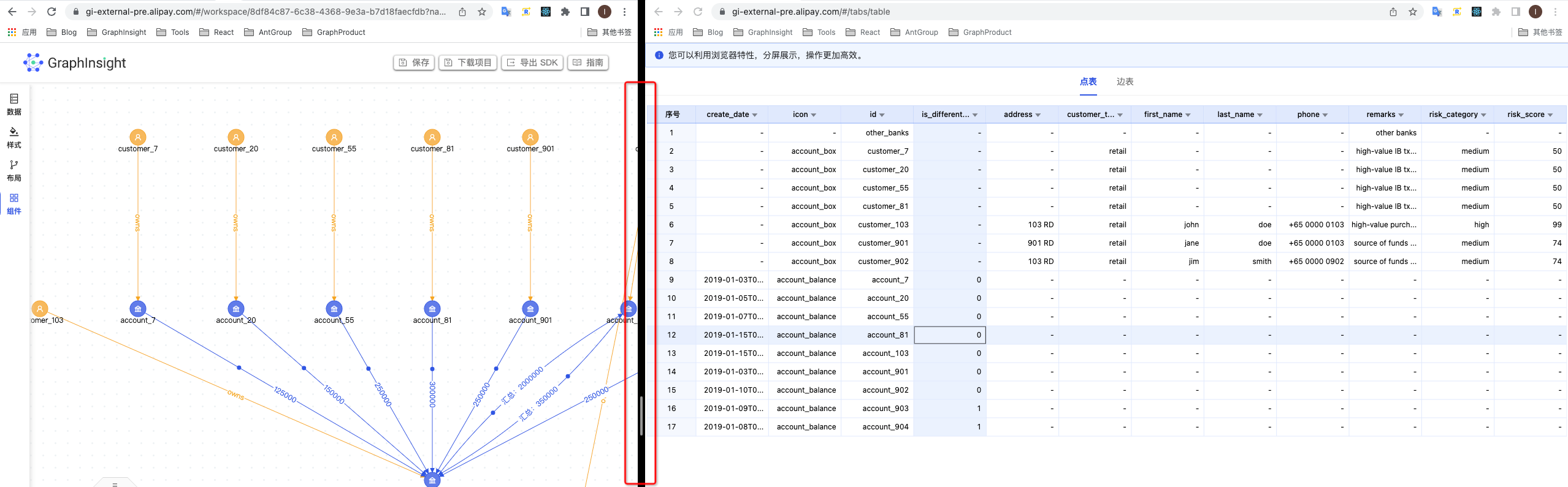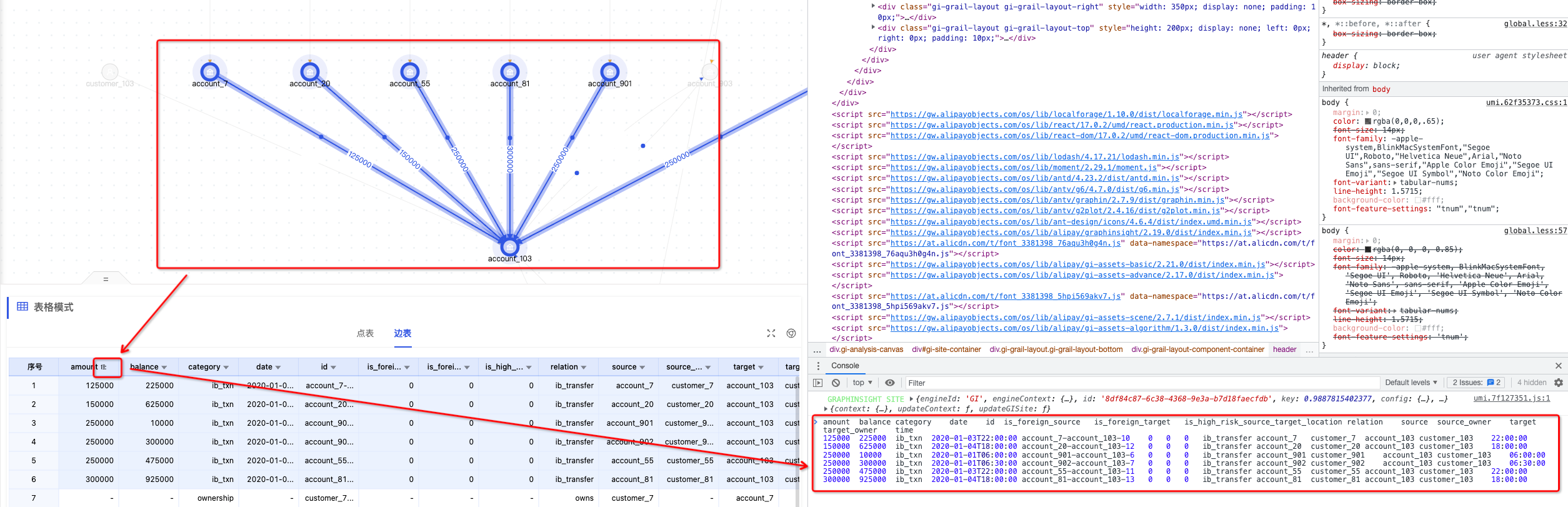 这个功能还是非常有用的,在上述的银行案例中,**两个银行卡之间的边上交易明细在图上被汇总起来了,**点击聚合边,其明细交易记录以表格形式的展示,这样就能够帮助分析师更精准地定位问题。