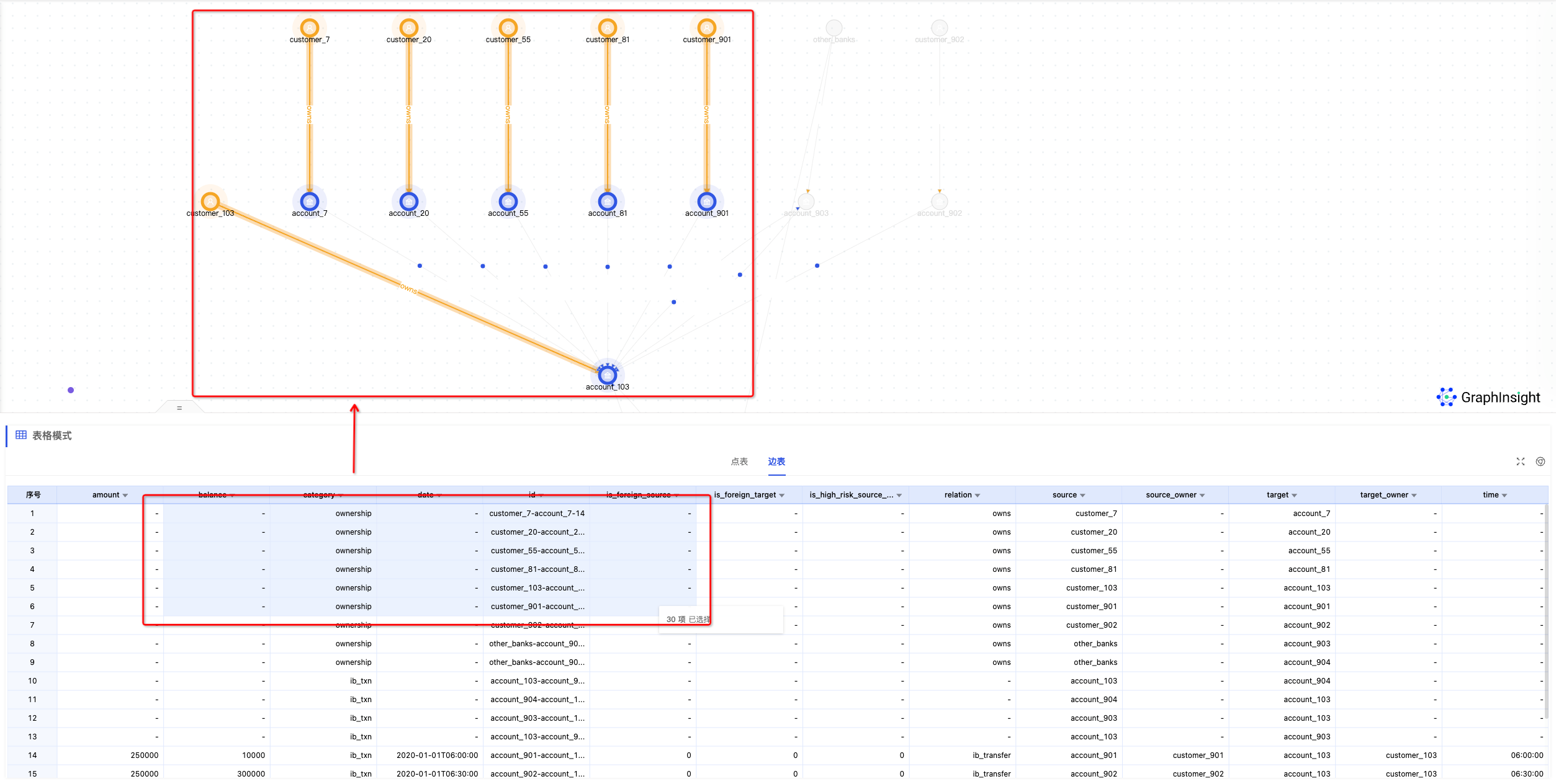 同理,我们也可以圈选画布,将选中的点边信息,以表格的形式展示。让我们不用一个个人工点开点边的详细信息,大大提高了分析效率。