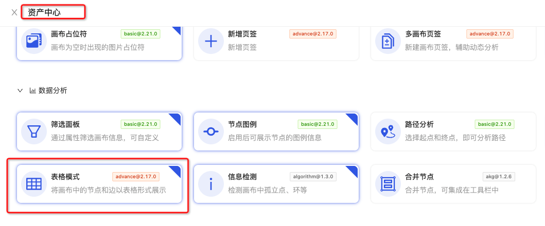 在资产中心中选择「表格模式」然后加载在容器组件中,即可使用