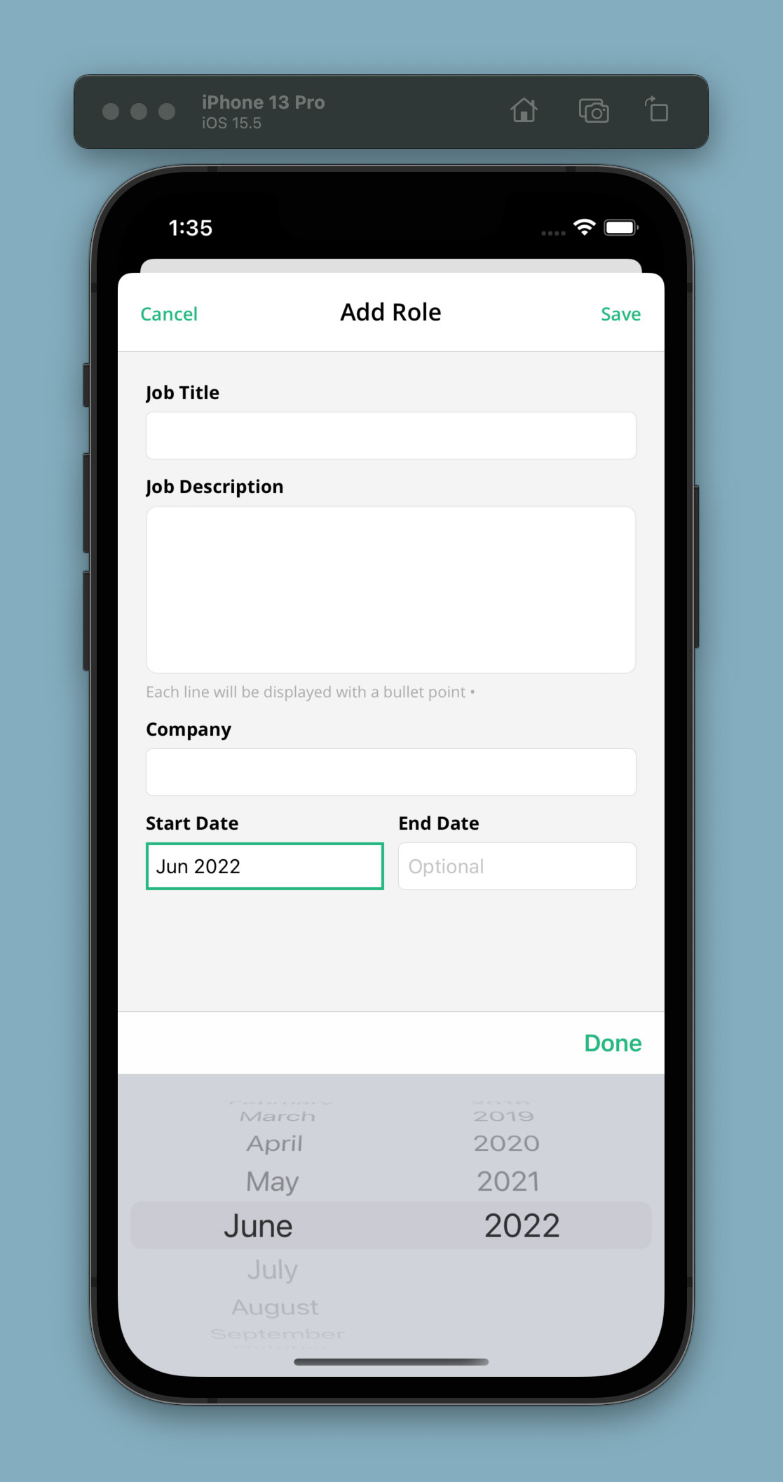 By default, the picker is set to a minimum date of the current month and year and a maximum date of the current month and 15 years in the future (as this makes sense for the most common usage of an expiration date picker for payment processing). This can be changed using the minimumDate and maximumDate properties. Just like UIDatePicker, invalid dates are shown in grey and will animate you back to a valid date (i.e. if your maximum date is June 2022, then when you scroll to September if will be greyed out and will scroll you back to June; if you then changed the year to 2023, all of the months would be available to you).