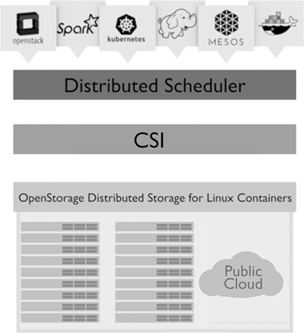 OpenStorage is a clustered implementation of the Open Storage specification and relies on the Docker runtime. It allows you to run stateful services in Linux Containers in a multi-host environment. It plugs into CSI and Docker volumes to provide storage to a container and plugs into Kubernetes and Mesosphere to operate in a clustered environment.