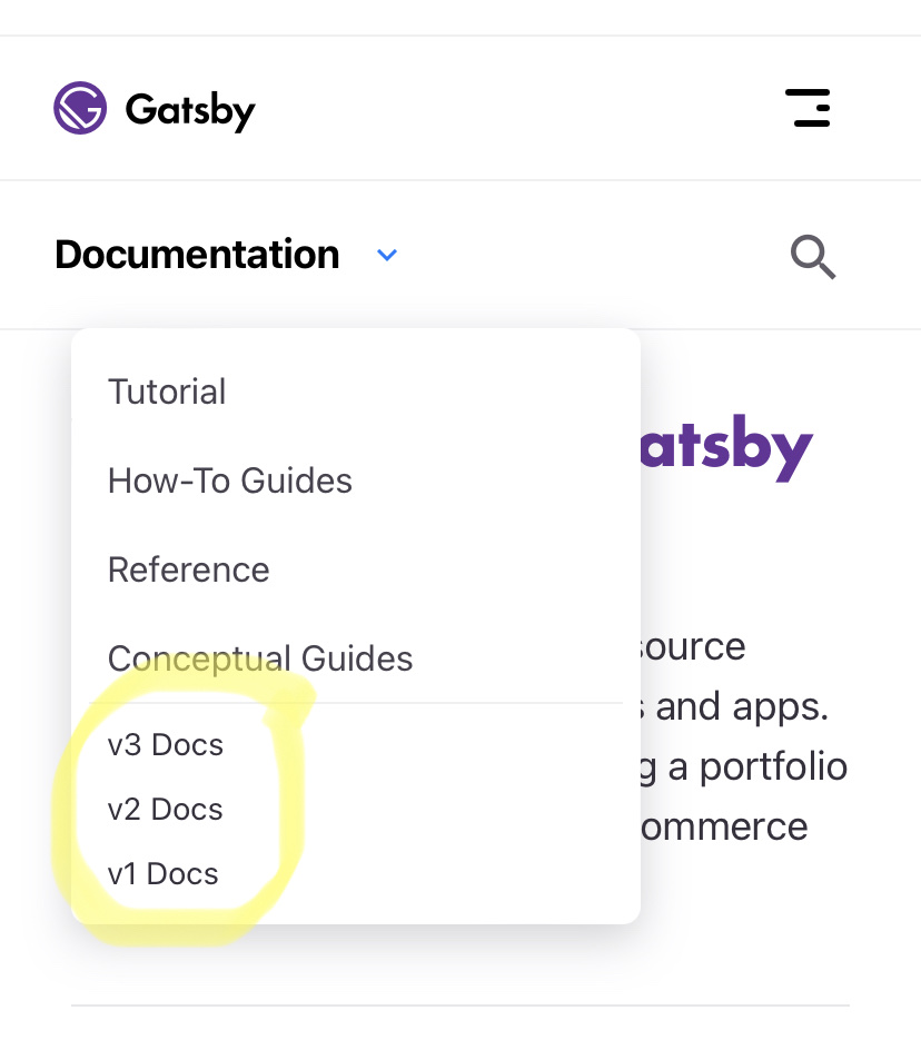 in the Gatsby documentation main dropdown, you can switch between major versions. |