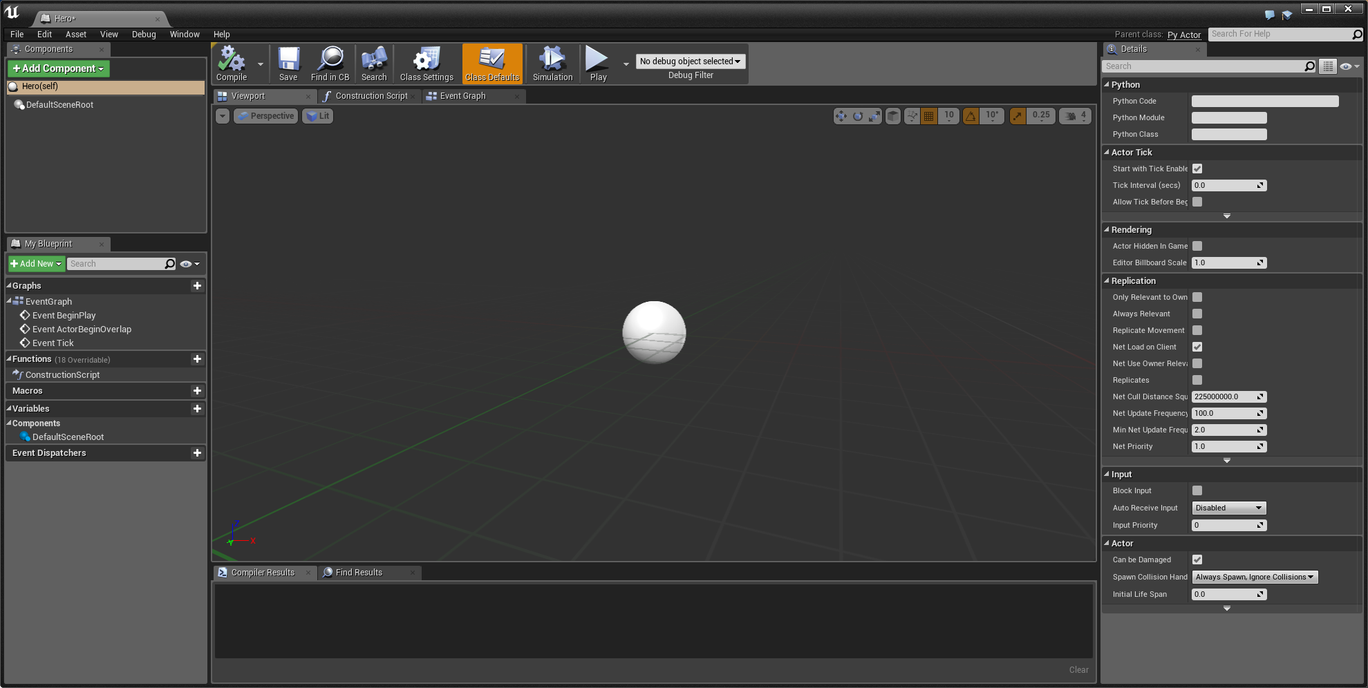 self.uobject.set_actor_location(location)Now, go back to the blueprint editor and set 'funnygameclasses' in the 'Python Module' field, and 'Hero' in 'Python Class'