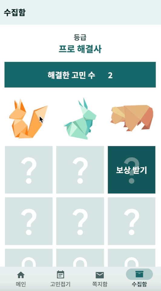 | 유저와 1:1 쪽지하기 | 미션 완료 후 종이접기 획득하기 | 미션 완료에 따른 등급 상승 |