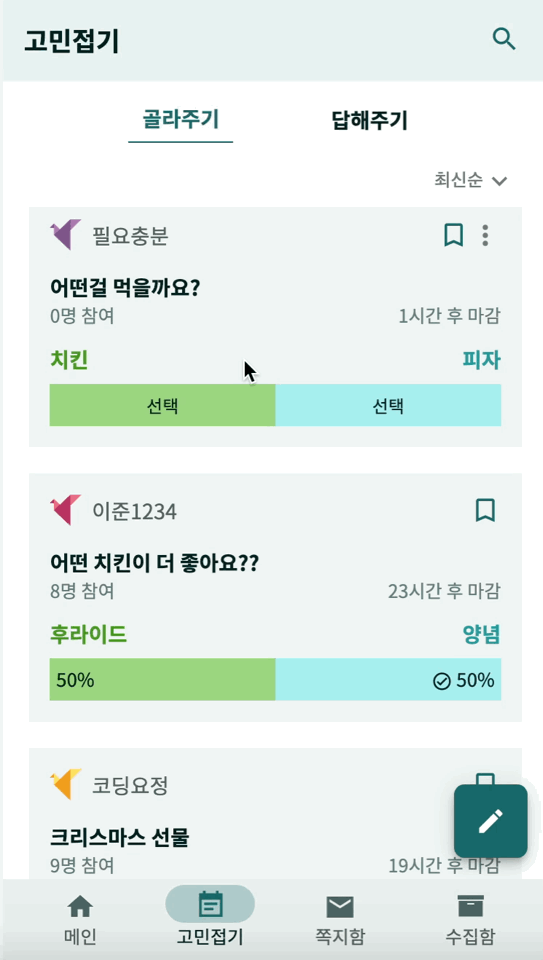 - Optimistic update UI (낙관적 업데이트) : ‘고민접기’의 ‘골라주기’ 탭에서 항목 선택 시 투표 결과를 보여주도록 구현이 되어 있습니다. 처음 서비스 개발 당시엔 데이터를 받아온 후 리렌더링 되어 유저가 결과를 볼 수 있도록 되어 있어서 즉각적인 결과를 보길 원하는 유저는 불편함을 느꼈습니다. 이를 개선하기 위해 react-query에 낙관적 업데이트를 적용하여 데이터가 정상적으로 받아올 것이란 걸 예상하여 반영하는 로직을 추가할 수 있었습니다.