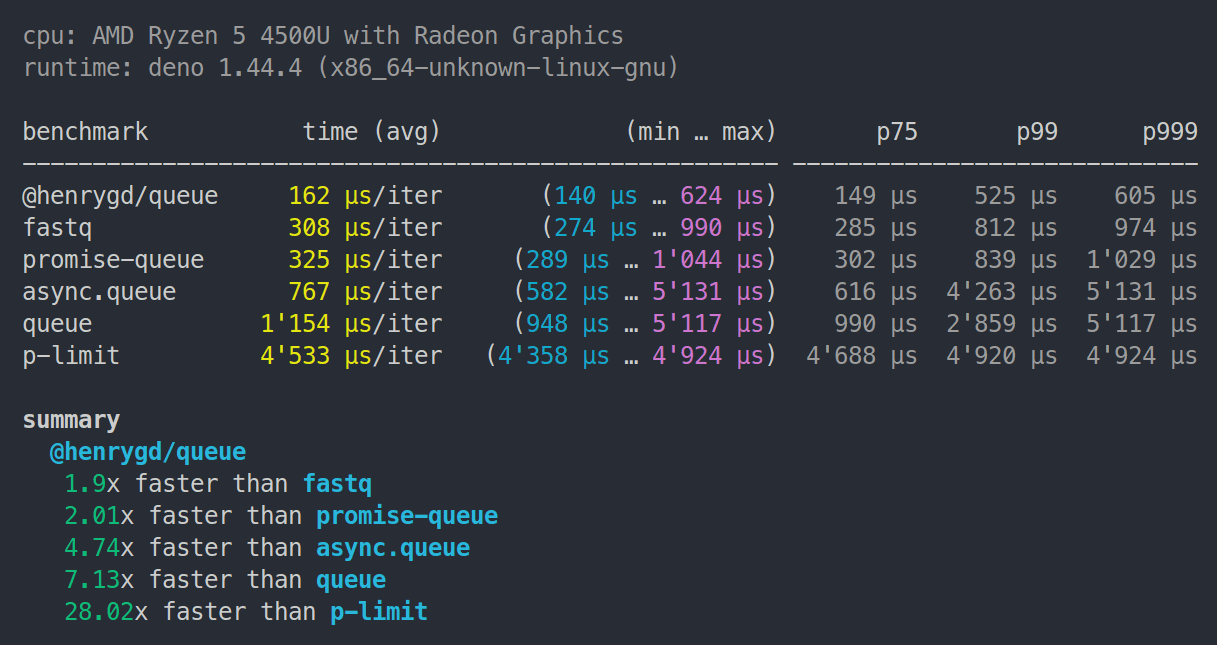 This test was run in Chromium. Chrome and Edge are the same. Firefox and Safari are slower and closer, with @henrygd/queue just edging out promise-queue. I think both are hitting the upper limit of what those browsers will allow.