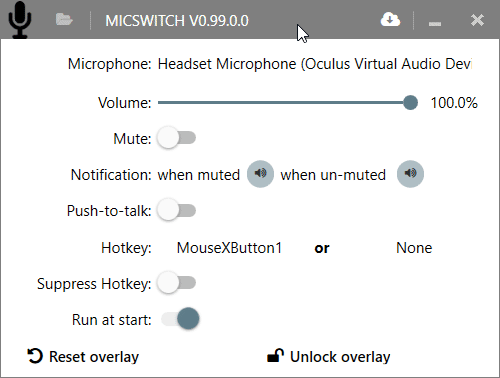 MicSwitch allows you to mute/unmute your system microphone using a predefined system-wide hotkey which will affect any program that uses microphone (no more heavy breathing during Skype conferences, hooray!) Also it supports configurable mute/unmute sounds(similar to TeamSpeak/Ventrilo) and a configurable overlay with scaling/transparency support. All these features allow you to seamlessly switch between chat apps and use THE SAME input system with overlay and notifications support.