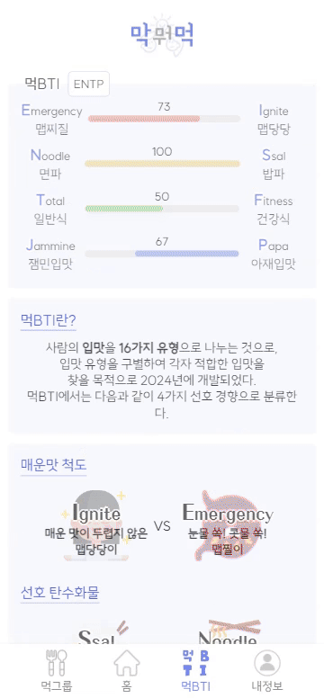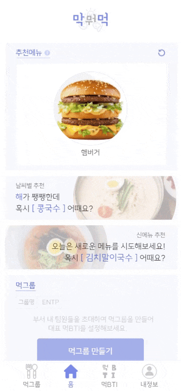 먹비티아이를 바탕으로 한 메뉴추천 (그 외 메뉴를 원할 시 룰렛 돌리기로 선택지 증가)