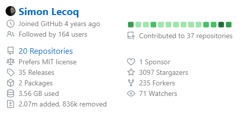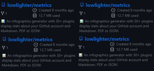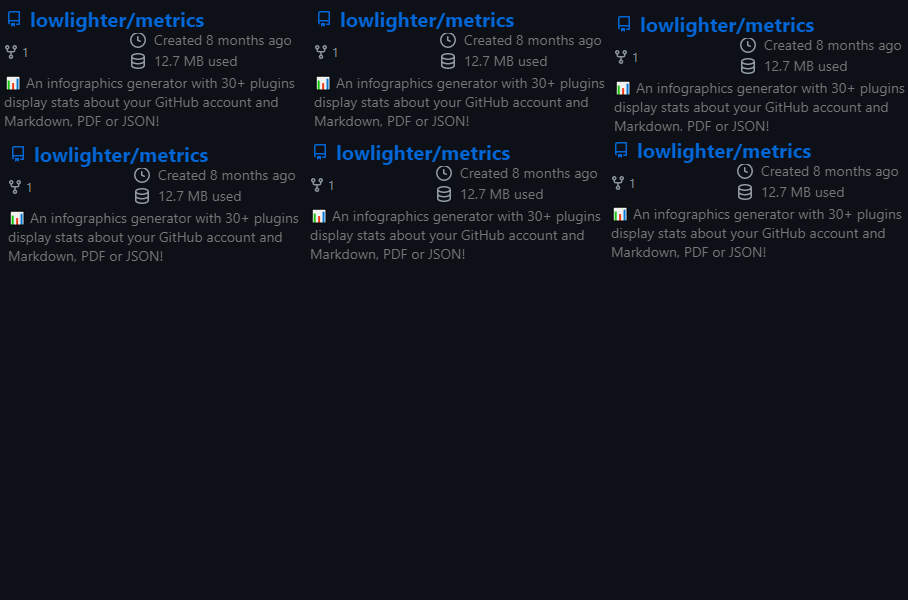 I really like the idea! It shouldn't be too hard to gather the data for it (it's actually possible that most of repositories data is already available since these are used in A configurable limit for users with lot of repositories seems nice. Another option to choose to display only repositories with a minimum amount of stats/forks using a github query like filter (what is used in |