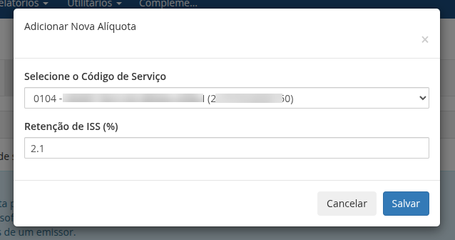 - Alíquotas: As alíquotas dos códigos personalizados agora estão associadas a um emissor. Ao cadastrar uma nova alíquota, o emissor vinculado ao código de serviço selecionado será exibido.