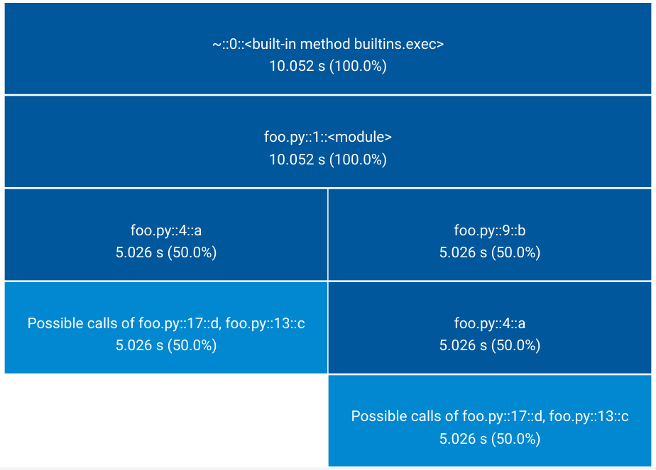 The root process (__main__) calls a() which spends 4 seconds in c() and 1 second in d(). __main__ also calls b() which calls a(), this time spending 1 second in c() and 4 seconds in d(). The profile, however, will only store that c() spent a total of 5 seconds when called from a(), and likewise d(). The information that the program spent more time in c() when called in root -> a() -> c() than when called in root -> b() -> a() -> c() is not present in the profile.