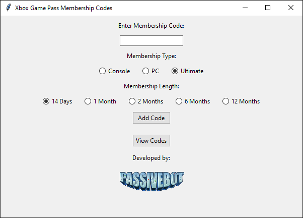 An open-source Python program to store and manage Xbox Game Pass membership codes in an SQLite database. The program uses Tkinter to create a graphical user interface (GUI) to enter and display codes. The program uses an SQLite database to store the codes, allowing the user to delete codes from the database. The program also includes a radio button group to select the code type and the membership length.