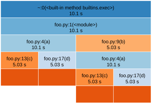 b()The root process (__main__) calls a() which spends 4 seconds in c() and 1 second
