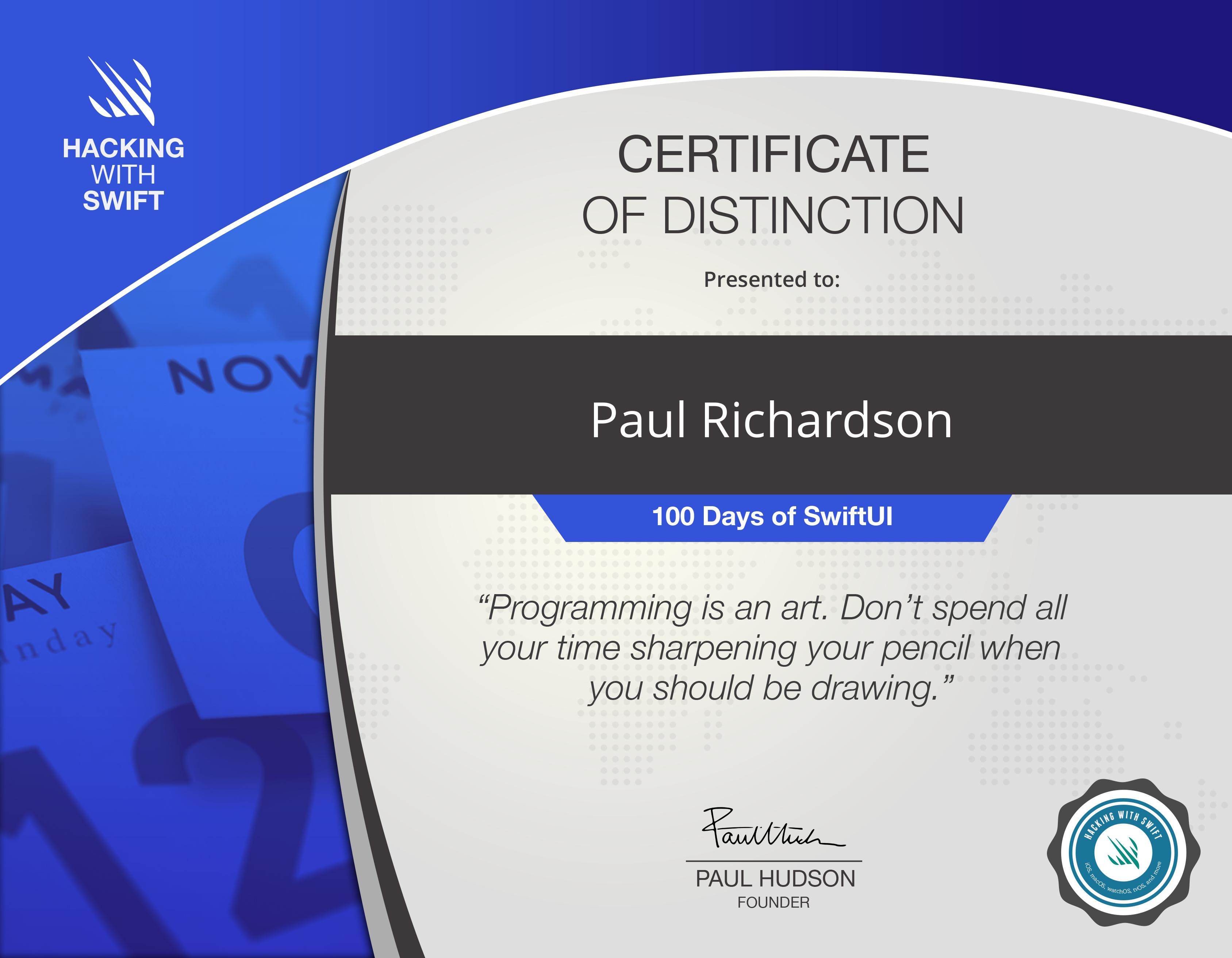 - ✅ 100 Days of SwiftUI completed, November 2020. (Certificate)