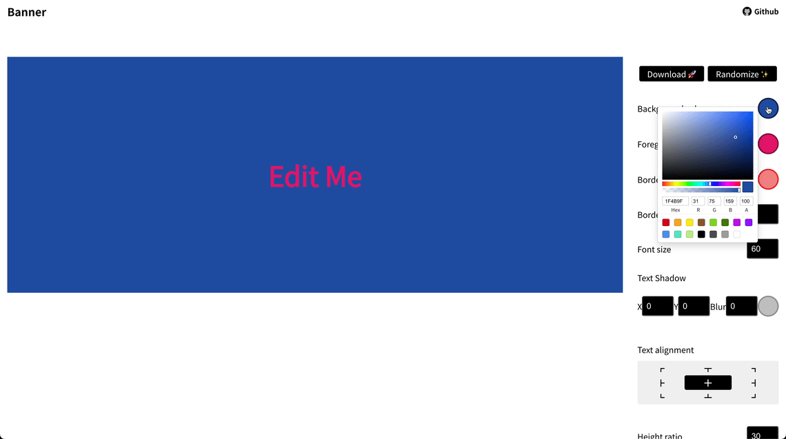 banner create app 📍데모 / 배포 / 백로그 🏷️ demo 🏷️ 백로그 🏷️ 배포 📆개발일정 2022.06.26 ~ 2022.07.06 ⚙️기술스택 Typescript, React, Styled-Components, Redux-Toolkit version v.1.0.0 v.1.1.0 업로드, 다운로드 기능 추가 이미지 업로드시 리셋 버튼 추가