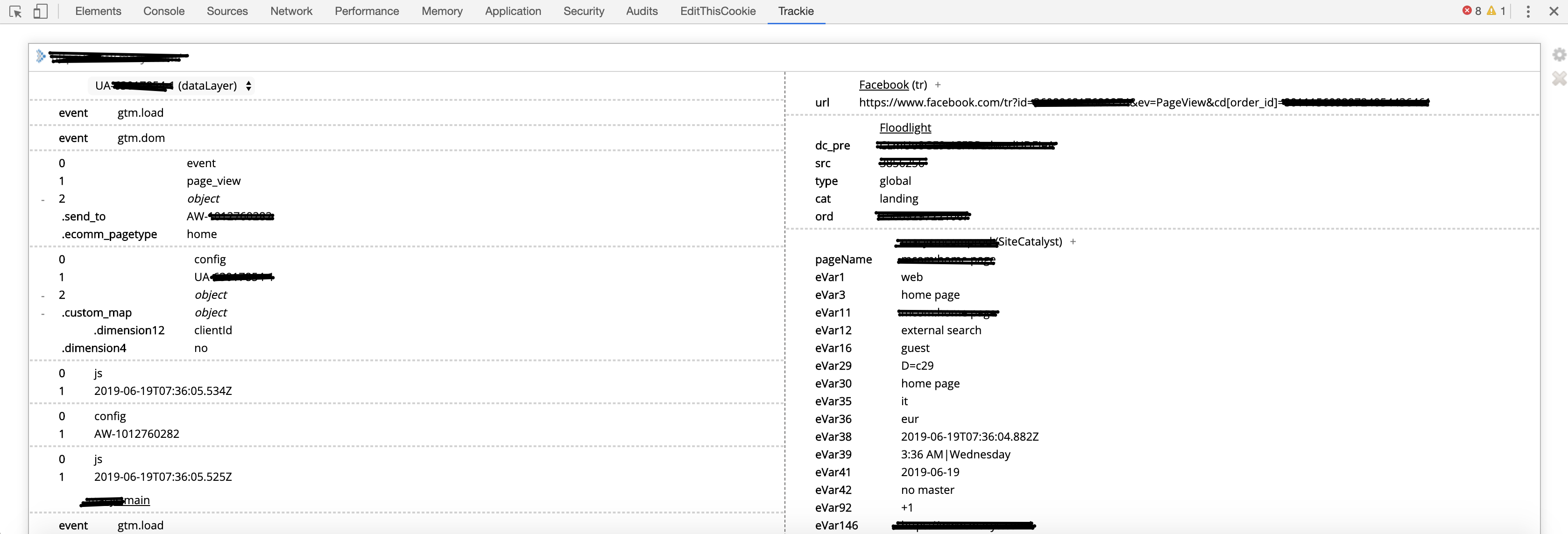 A new panel will appear in Developer Tools titled Trackie, containing a page group and URL for each pageload in the tab, with each push to the dataLayer variable (in the case of GTM's array-based data layer) appearing in a subgroup.