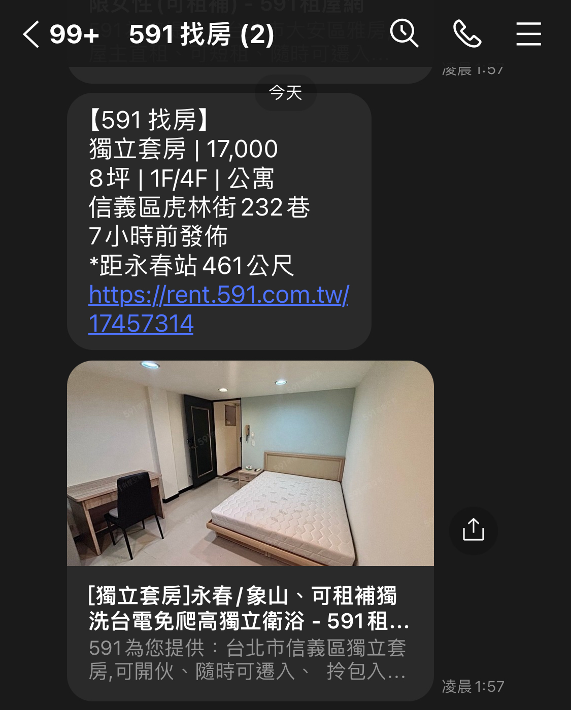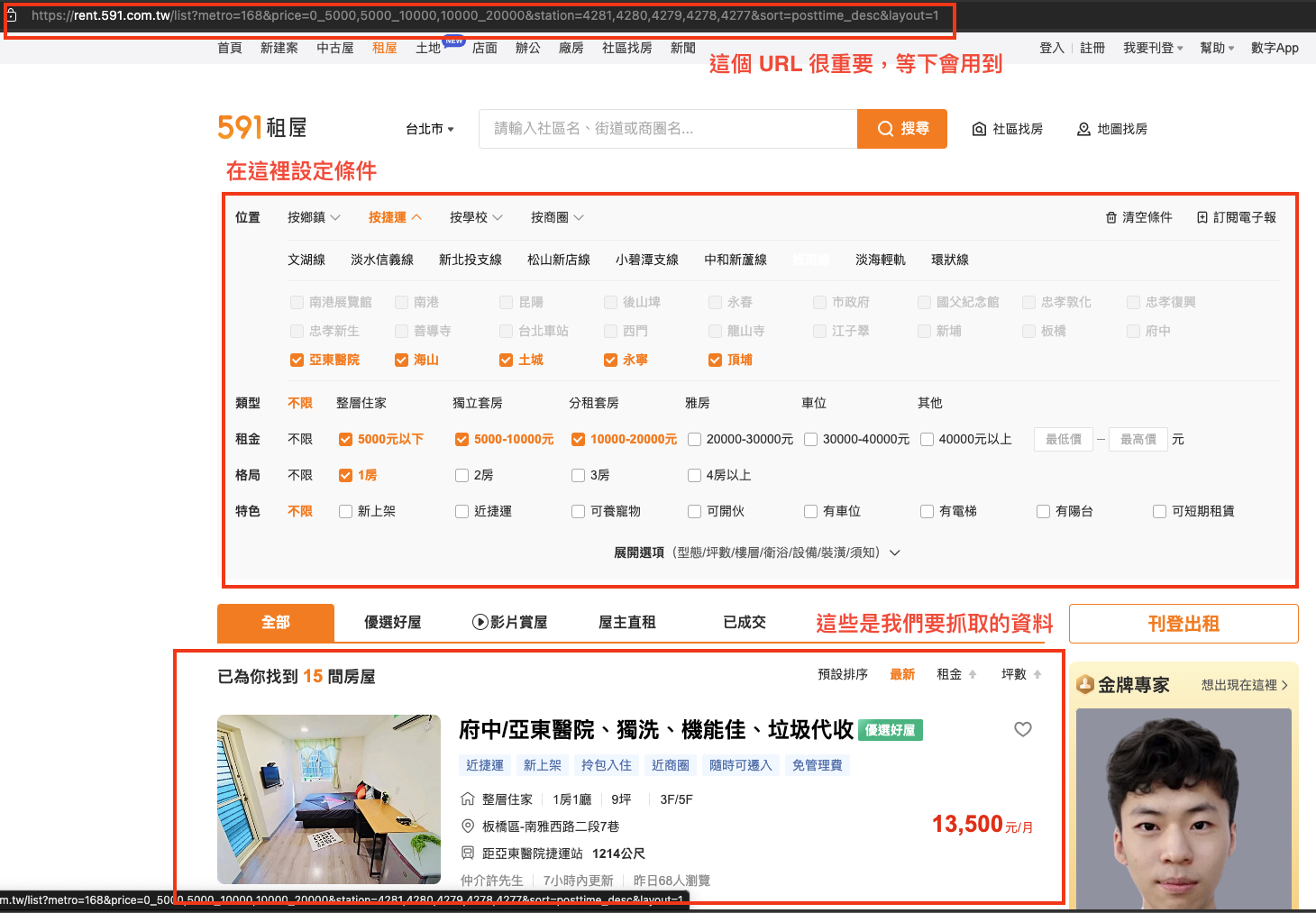 如下圖所示,可以根據偏好設定 591 租屋網的的條件,並且記住設定後的 591 網址