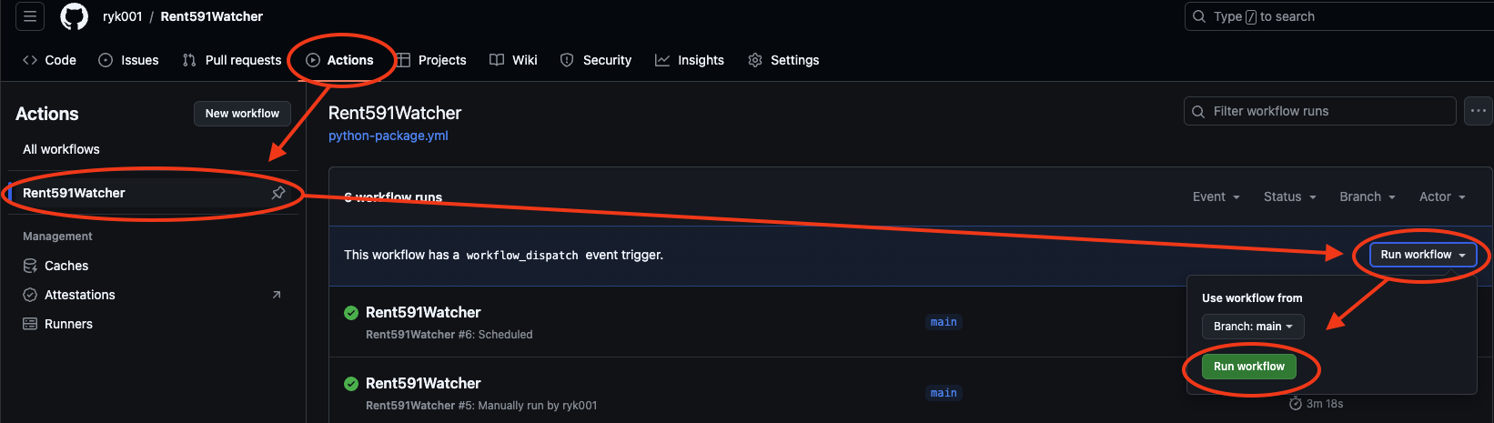 返回項目主頁面,點擊上方的Actions,再點擊右側的Rent591Watcher,再點擊Run workflow