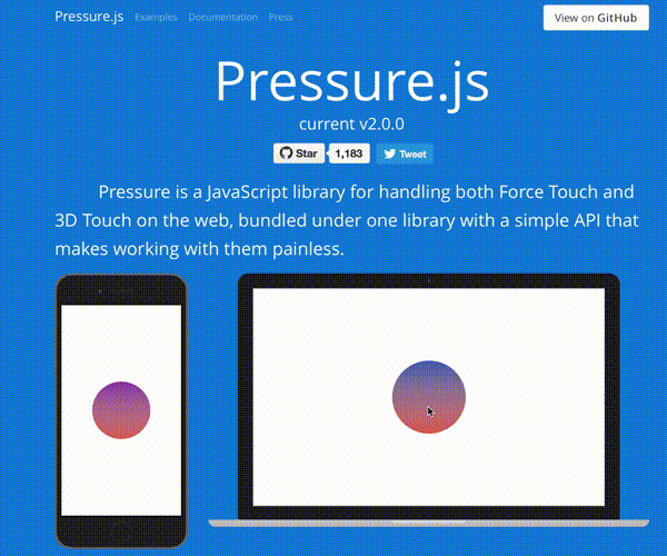 Pressure is a JavaScript library for handling both Force Touch and 3D Touch on the web, bundled under one library with a simple API that makes working with them painless.