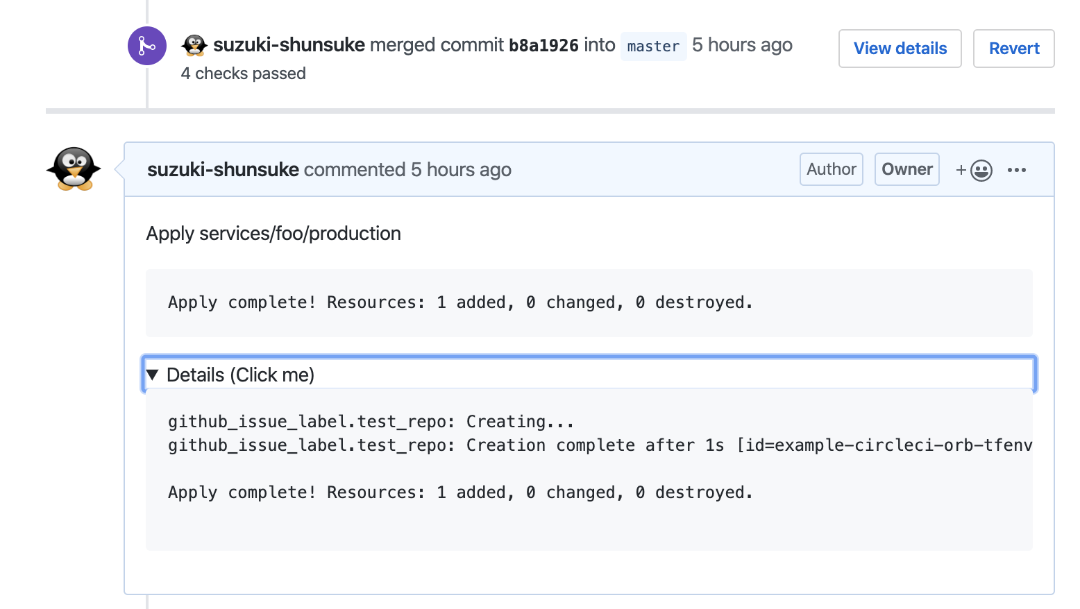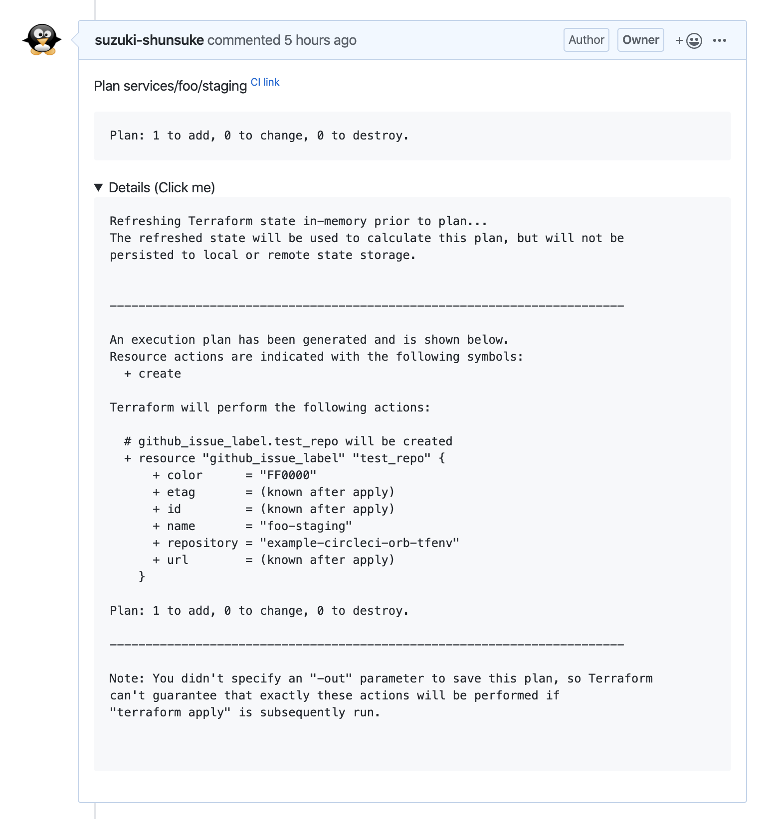 The results of terraform plan and terraform apply are posted by tfnotify. Ofcourse you can change the format of the comment by tfnotify's configuration.