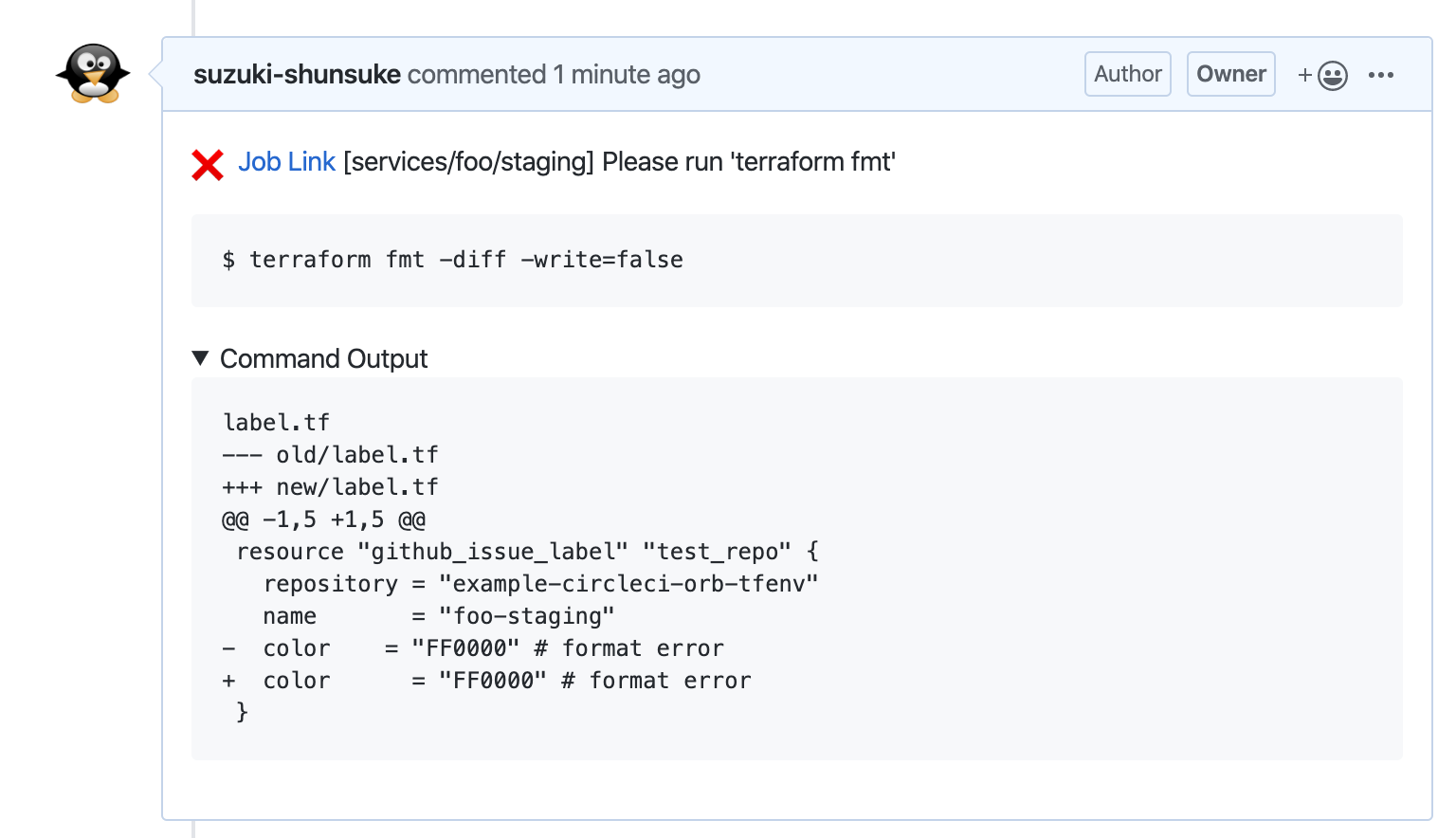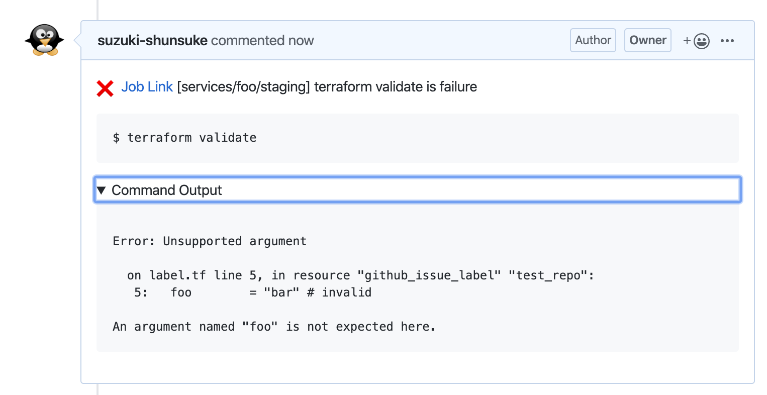 When it is failed to run terraform fmt -check or terraform validate, the result is posted by github-comment-cli.