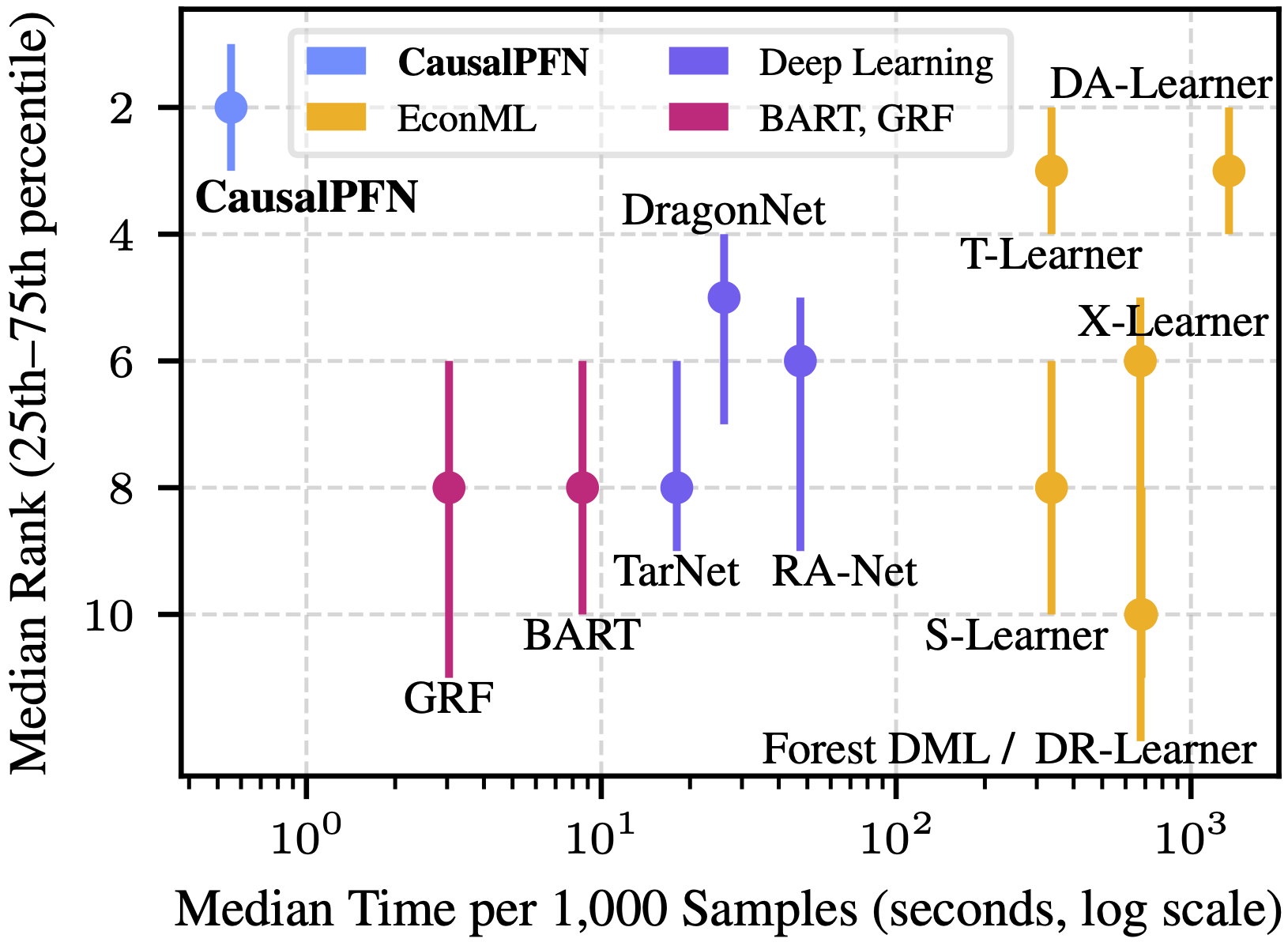 Time vs. Performance. Comparison across 310 causal inference tasks from IHDP, ACIC, and Lalonde. CausalPFN achieves the best average rank (by precision in estimation of heterogeneous effect) while being much faster than other baselines.