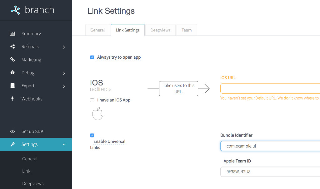 Settings->Link Settings, activateEnable Universal Links, fill inBundle identifierandTeam ID.