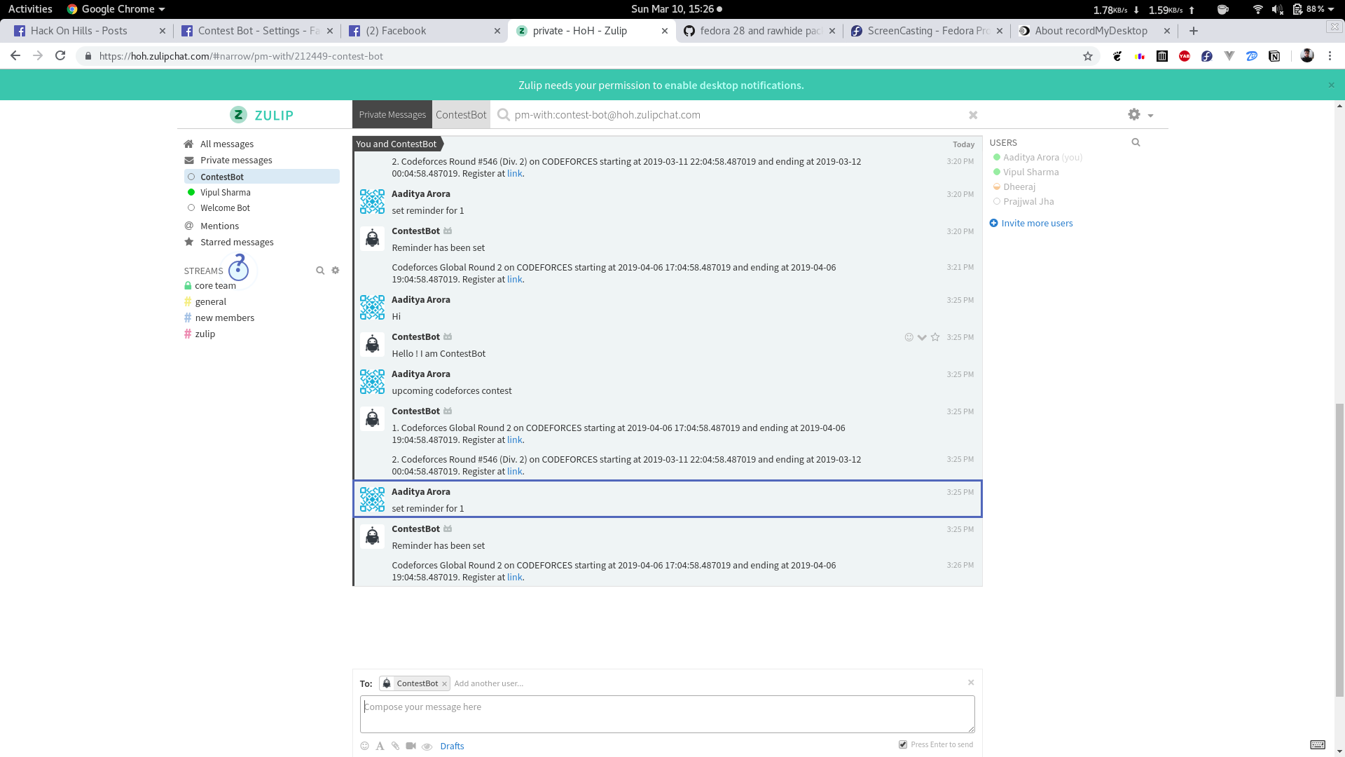- The main process (process.py) runs on the server and listens to responses from Zulip/ FB Messenger, then DialogFlow processes the message to get the relevant response, which contains the contest info from the backend.