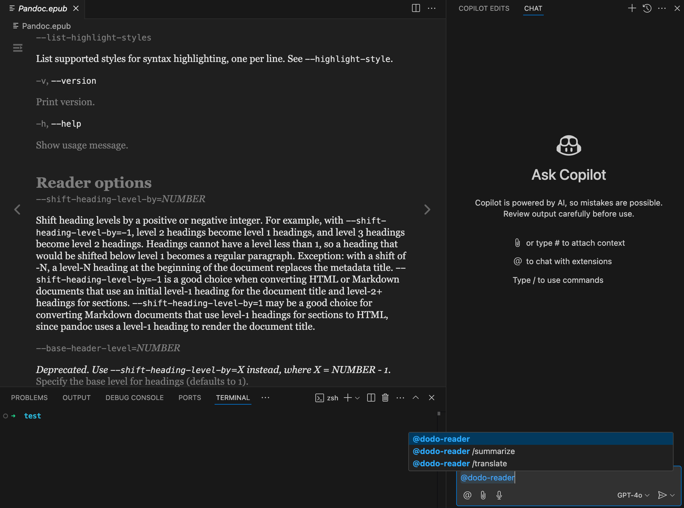 Dodo Reader is a Visual Studio Code extension that allows reading various formats like EPUB/PDF and integrates Copilot AI to assist your reading.